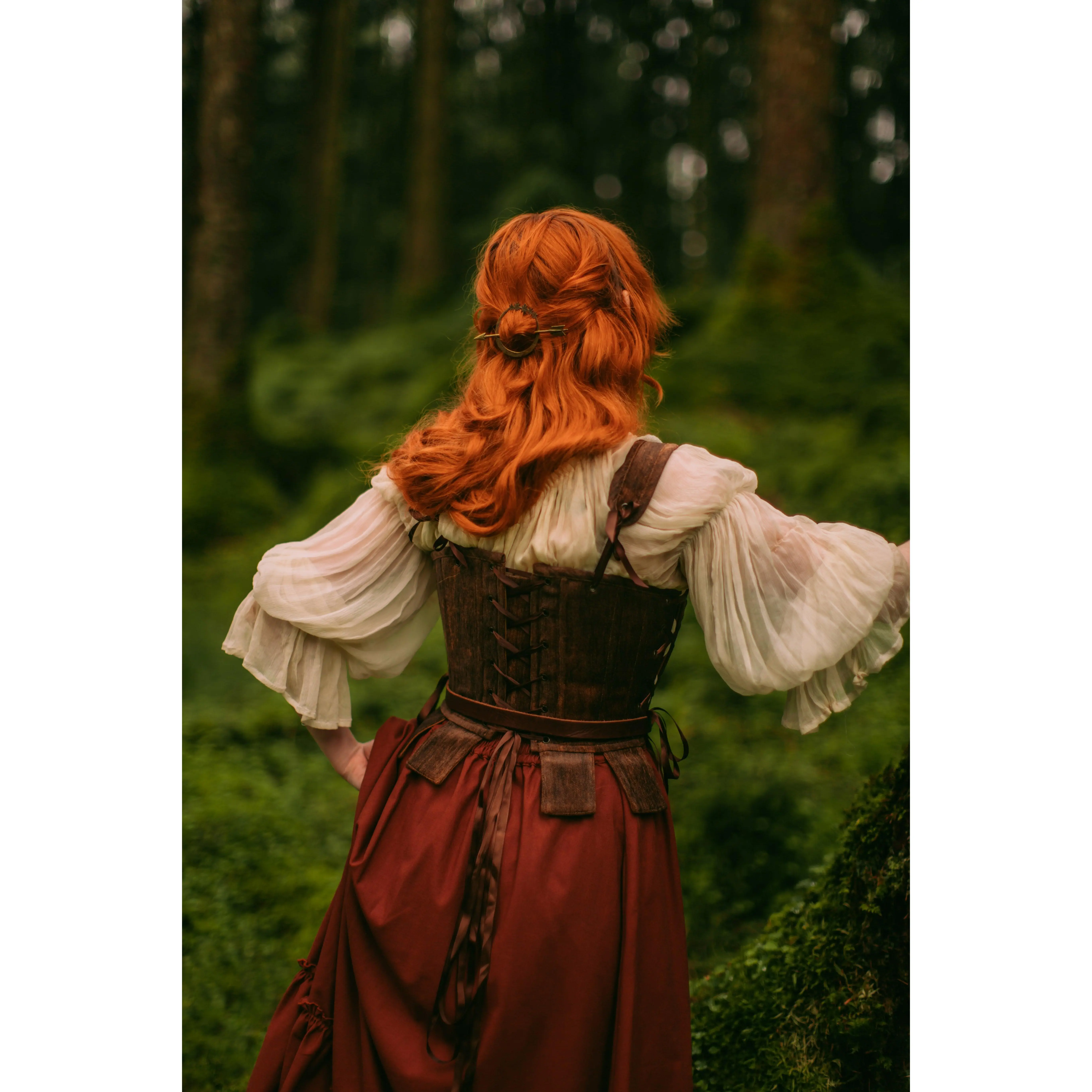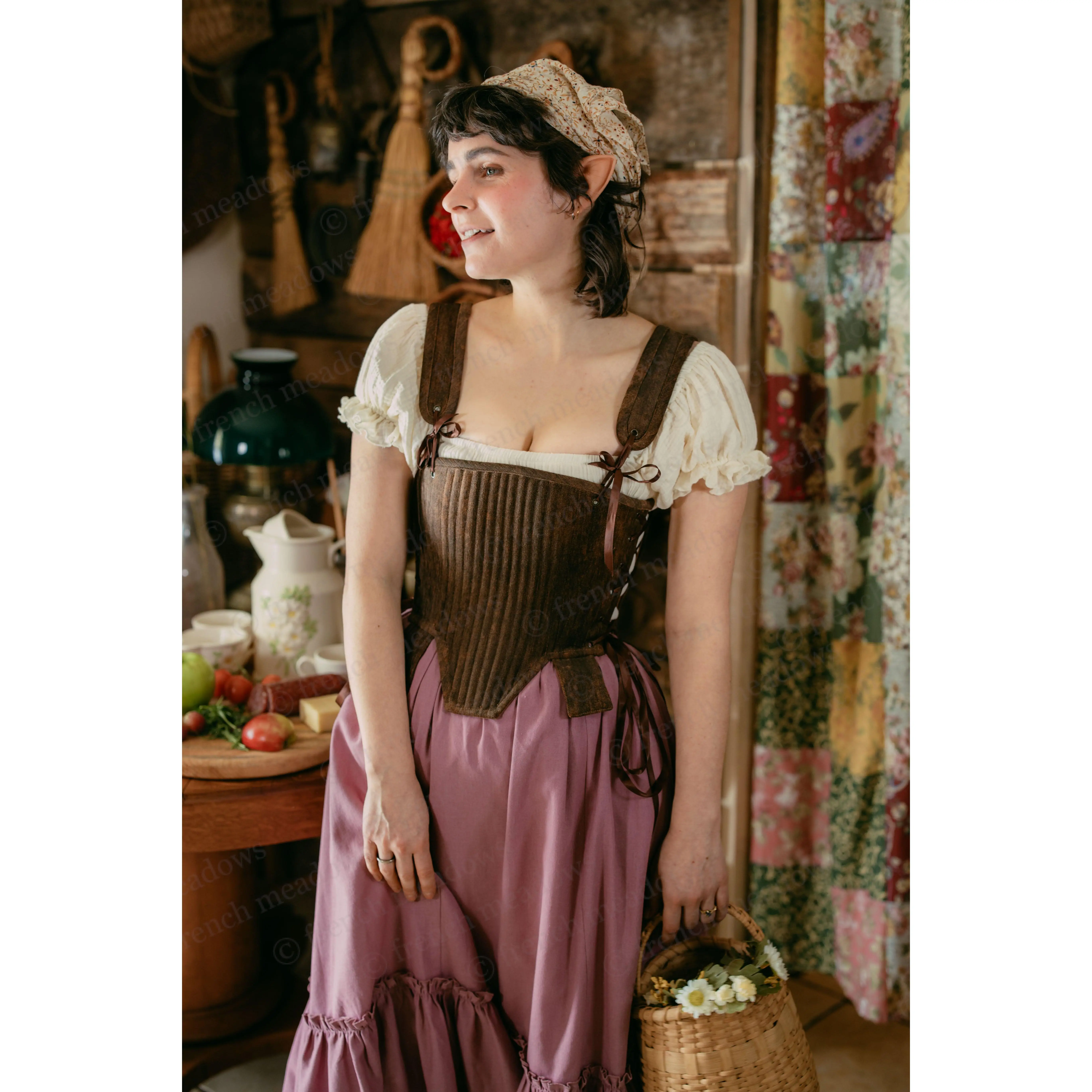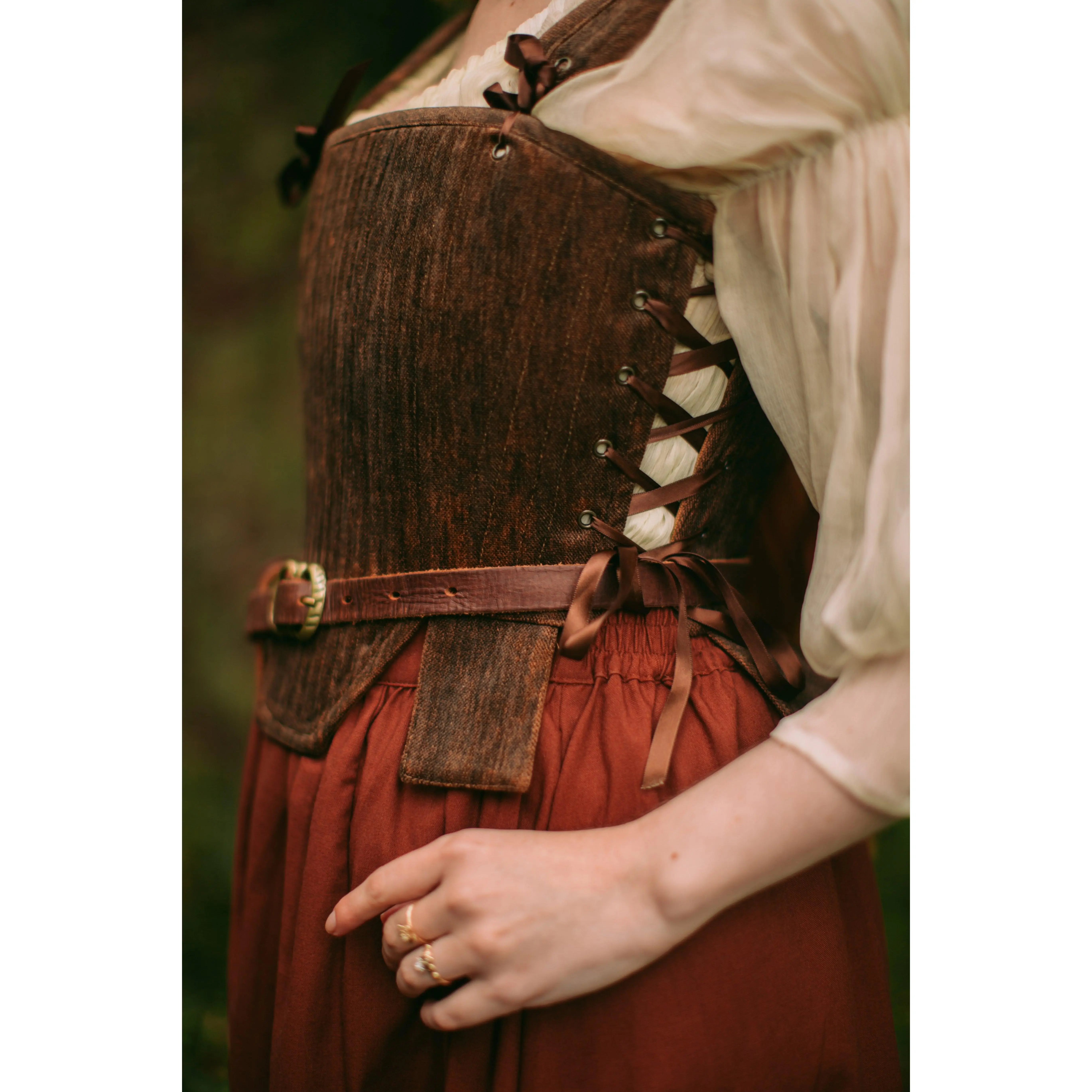 The brown tabbed Tudor stays are my attempt at making a piece that looks like leather armor with fabric! I originally designed these for more of a masc look, but they actually look so cute styled femme as well?! Paired with this brown skirt and the cream milkmaid dress (which is back btw!!) I feel like a little hobbit girl.  This style of corset is the same as the silver stays I showed off earlier this week, and complete with details such as: ~*~ side AND back lacing ~*~ removable shoulder straps ~*~ lots and LOTTSSSS of boning in the front for added bust support Which way would you style it? #medievalfashion #medievalcore #renaissancefaire