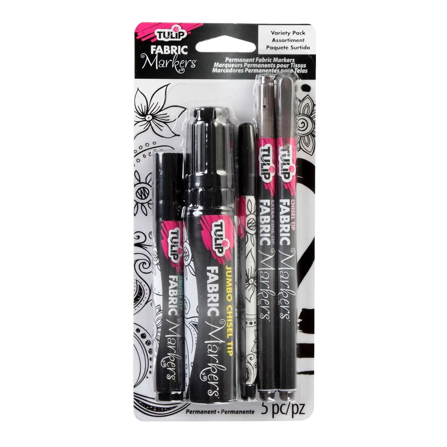 Give your fabrics a boost of color with Tulip Fabric Markers This Black Variety 5 Pack includes a brush tip, fine tip, extra fine tip, chisel tip, and jumbo chisel tip markers that are perfect for drawing on fabrics. Tulip Fabric Markers dry permanently on light-colored fabrics, so let your imagination take over on clothing, shoes, bags & backpacks, and other DIY craft surfaces! The bright and bold premium-color inks keep your creativity from fading, even after multiple machine washes. No heat-setting required.