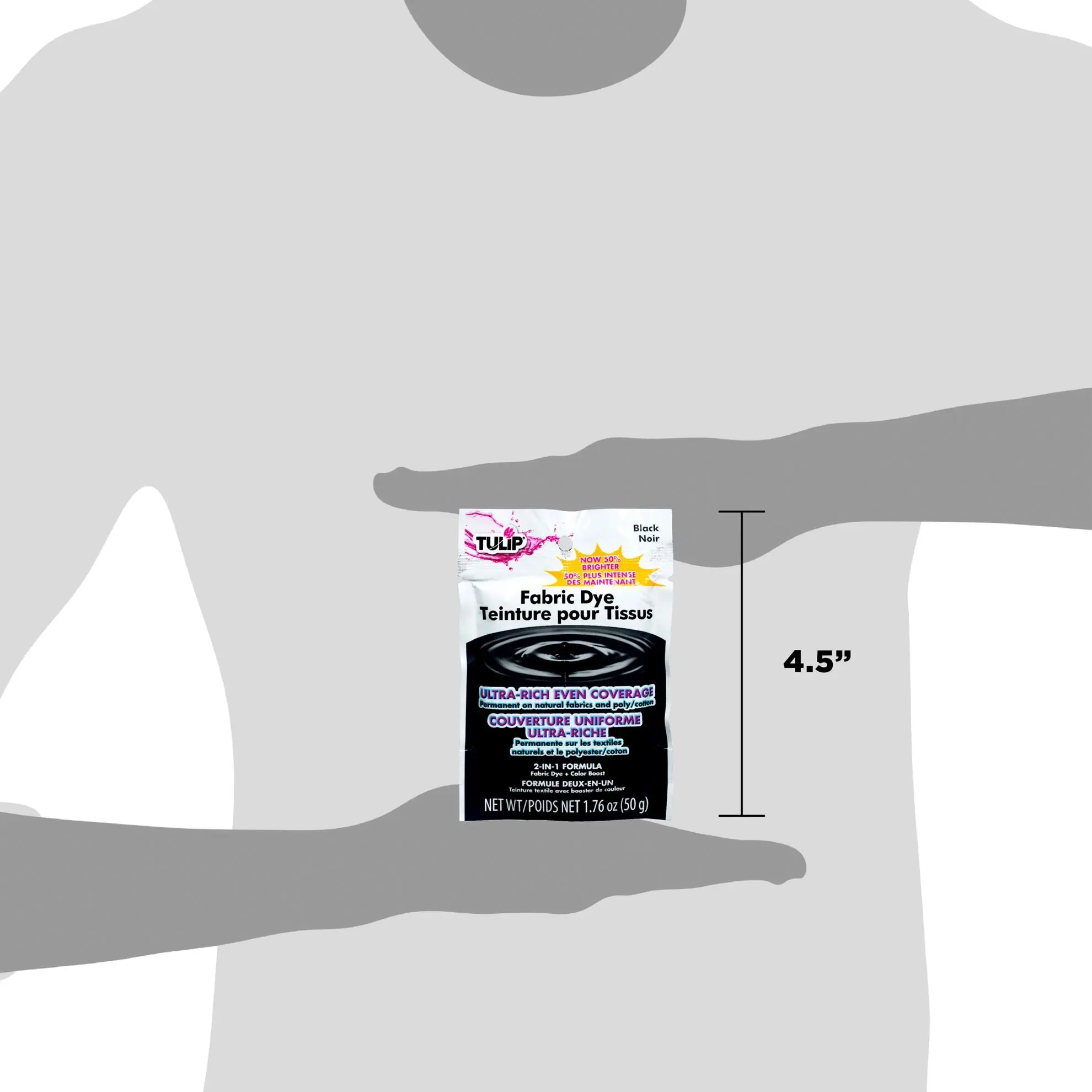 Tulip Fabric Dye is your solution for one-color dyeing, re-dyeing and dip dyeing. This formula utilizes the classic hot water dye method for ultra-rich, even dye coverage and is most vibrant on natural fabrics such as 100% cotton, rayon, linen, and silk. Tulip Fabric Dyes are mixable so you can customize every project with beautiful, permanent color. Contains 1.76 oz of Black Fabric Dye; one packet makes 1 gallon of dye, which can be used to dye up to ½ pound of fabric. (Note: This is an estimate and actual amount of dye per project and dye vibrancy depends on the user, the size of the fabric, and the fabric itself.)