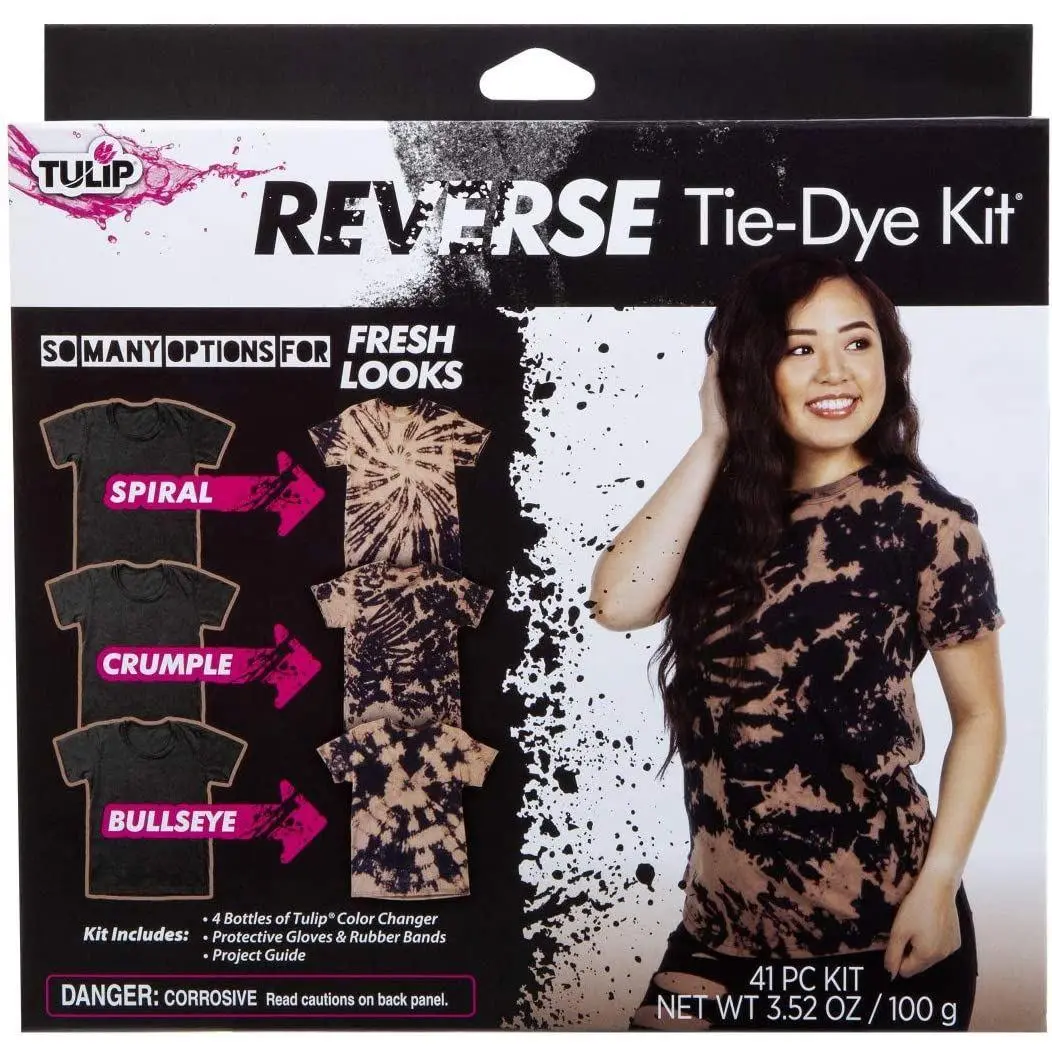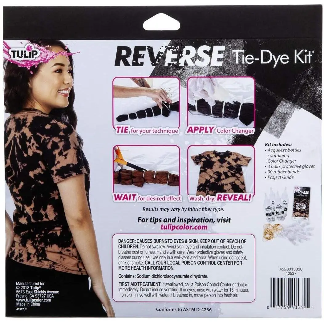 Create totally new, totally fresh tie-dye looks with the Tulip Reverse Tie-Dye Kit! Take the traditional look of tie dye to a whole new level by removing color instead of adding it. Say what? Thats right! Tie up your fabrics the way you would for any tie-dye project, then apply the Color Changer in place of dye, wait until youre happy with the color removal process then wash, dry and reveal for a fresh take on tie dye. Kit includes 4 bottles of Color Changer, 3 pairs of gloves, 30 rubber bands and a project guide.
