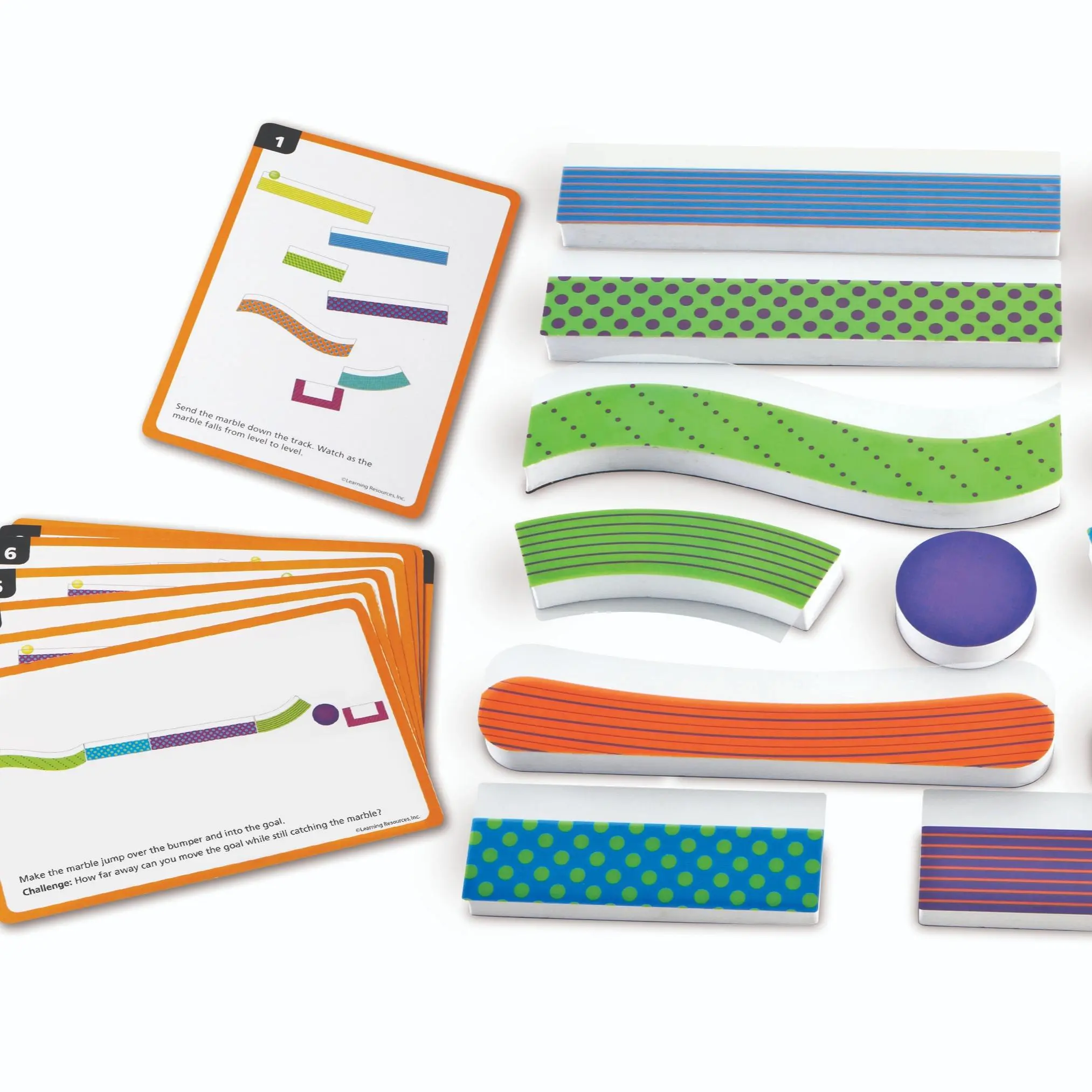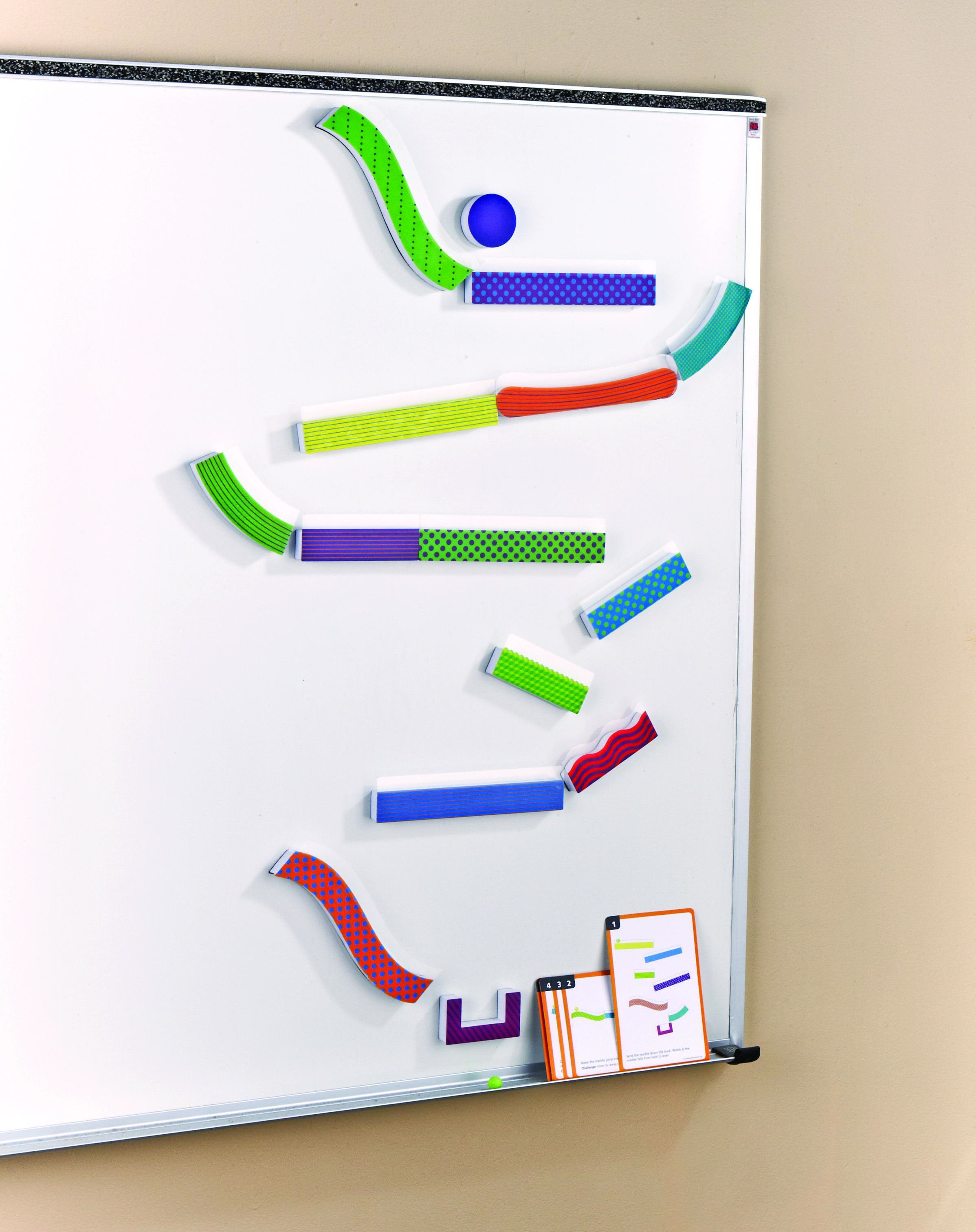 ·COMPLETE STARTER SET - Includes 14 colorful magnetic foam track pieces, 4 marbles, goal basket, and 10 activity cards with pre-designed challenges to inspire countless creative combinations