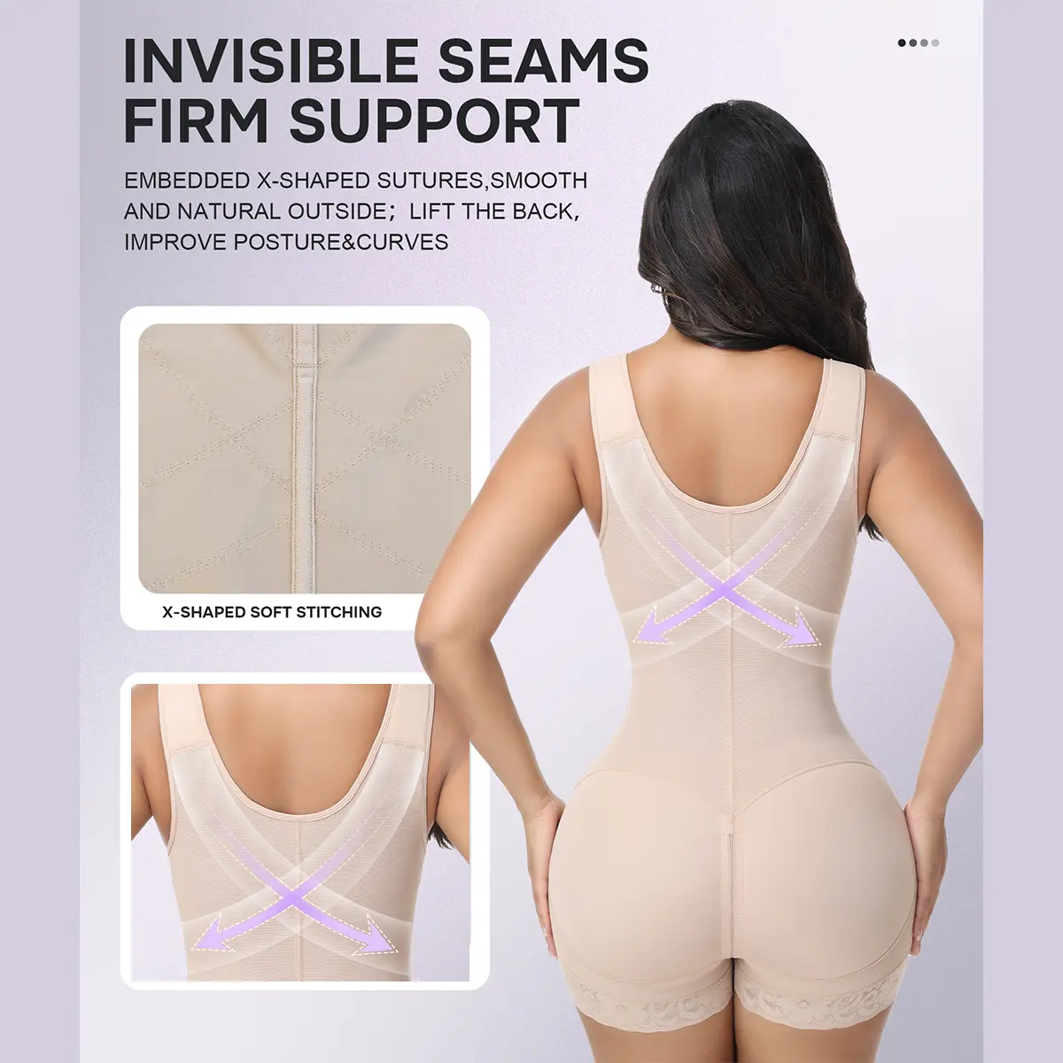 This faja body shaper features hidden X-shaped stitching that seamlessly smooths the back under clothing. It also lifts and supports the body, helping to improve posture and keep you elegant.