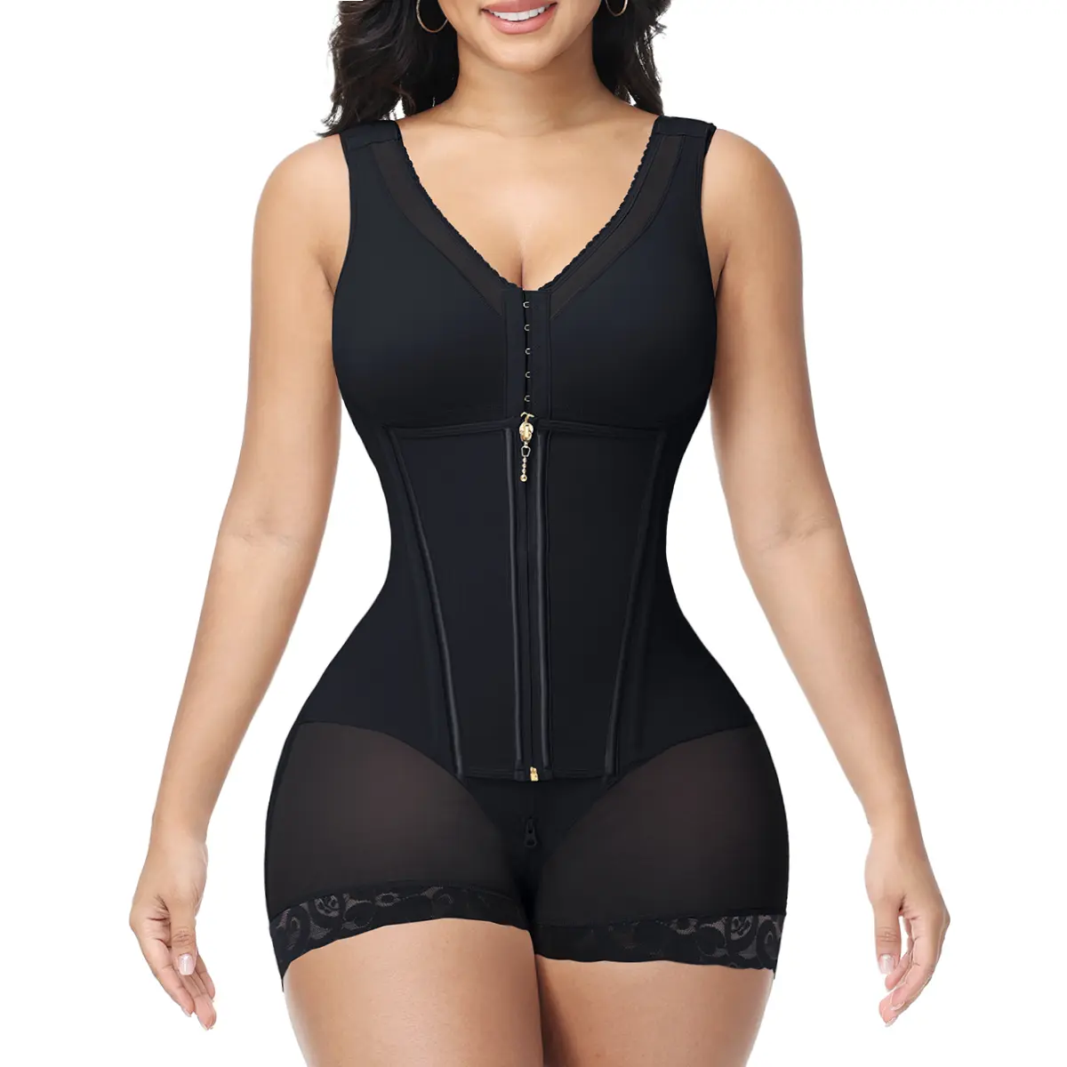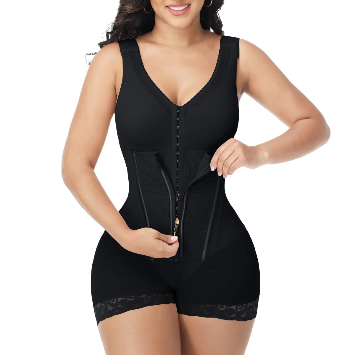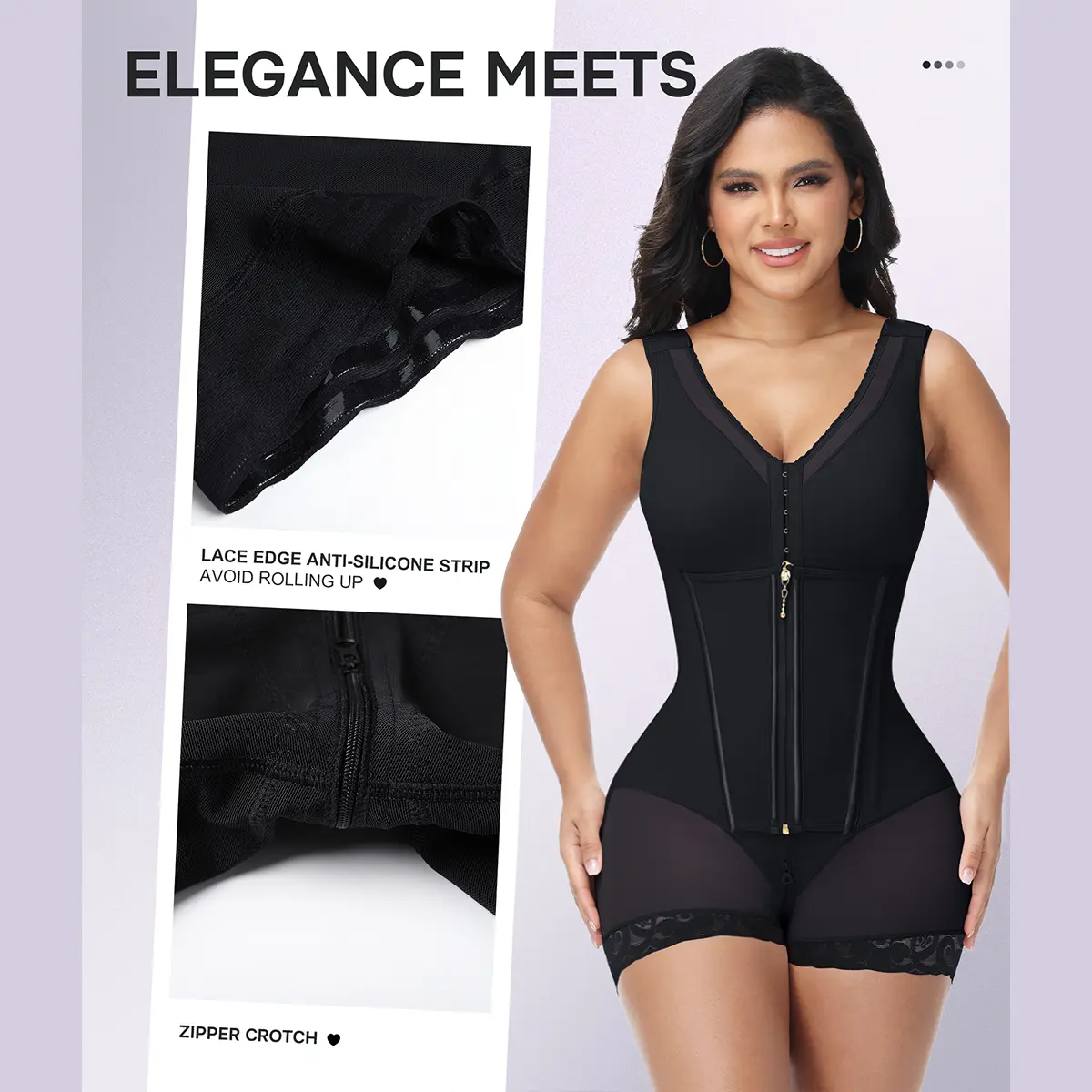 This faja body shaper tummy control features four adjustable shoulder straps to accommodate different body shapes and provide a secure fit. The crotch zipper offers convenience for restroom breaks, and the lace trim prevents curling. The single-layer fabric on the legs is breathable and lightweight, allowing for long-term wear without discomfort.