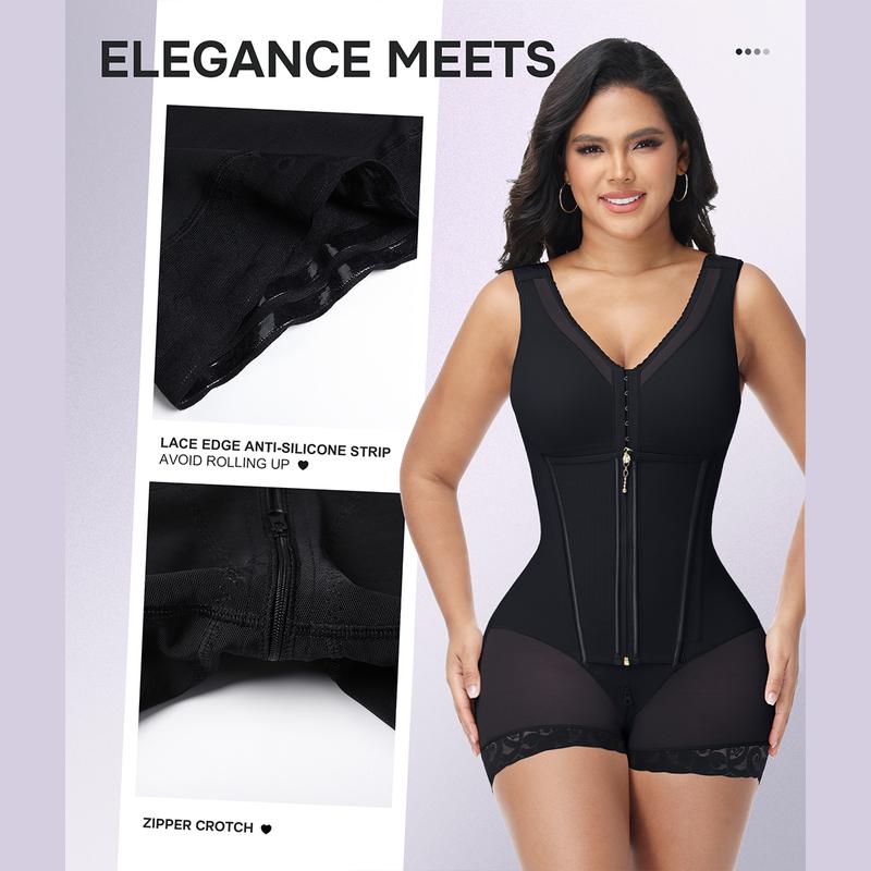 The V-shaped bust design of these fajas moldeadoras de cintura y abdomen gathers and enhances the bustline, preventing outward expansion.The high-stretch hip fabric provides firm compression, preventing sagging, and creates a fuller, rounder, and lifted butt curve.