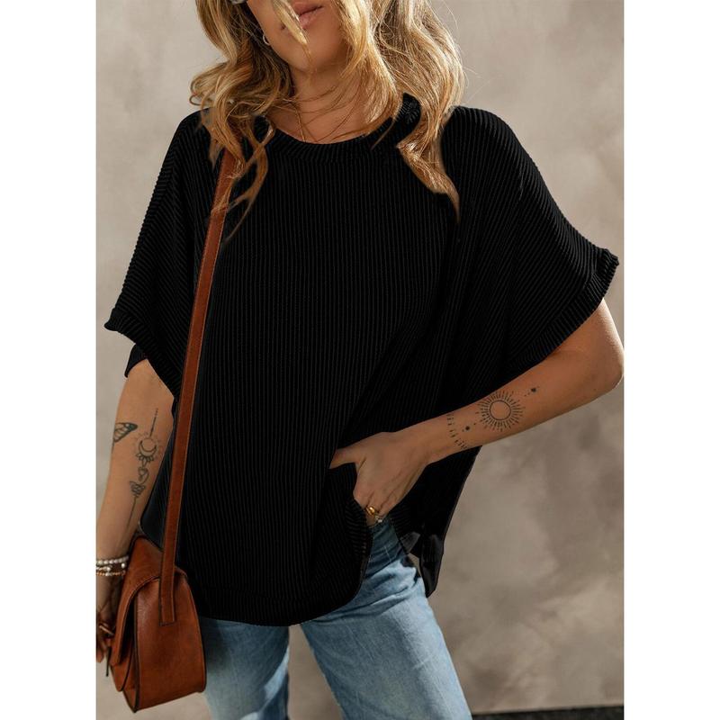 ·Feature: Short Sleeve Tops for Women, Solid Color, Crew Neck, Loose Dolman Style Short Sleeves, Basic Tunic Tops, Women Texture Knit T Shirts, Side Slits, Unique Knitting Pattern, Loose Fit Pullover Top.