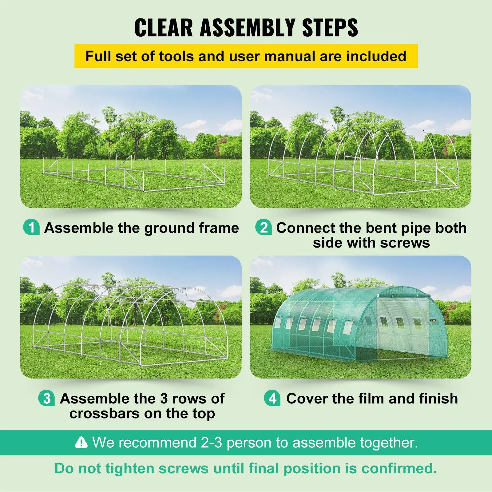 ·All Tools Included: The hoop house greenhouse is easy to assemble with connectors, and screw covers can prevent scratches and rust.Includes 4 ropes, stakes, and guy ropes for added security, stability, and strength. Note: Do not tighten screws until the final position is confirmed.