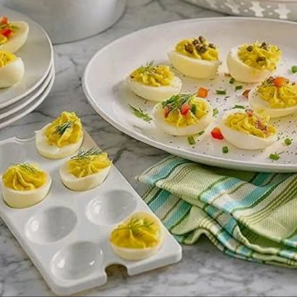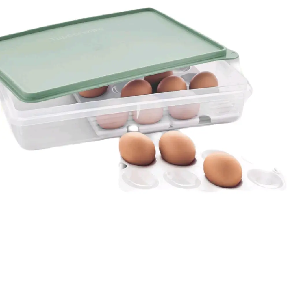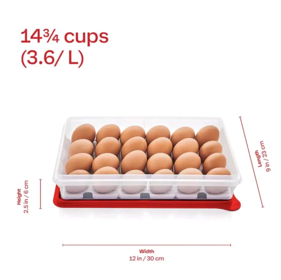 Tupperware® Snack-Stor® Large Container with 3 Inserts Tupperware's versatile large food storage container is perfect for storing rolled sandwiches and wraps in the fridge. And now it's got three bonus egg inserts to keep up to 24 eggs! This versatile container's not just for use in the kitchen—you can take it with you to parties or buffets. The lid's tight seal not only keeps everything fresher, it allows you to stack other storage products on top without damaging the container's contents. What You Get Rectangular container Lid 3 trays that each hold 8 eggs Use & care guide Good to Know Dishwasher safe Not freezer safe Not for use in microwave