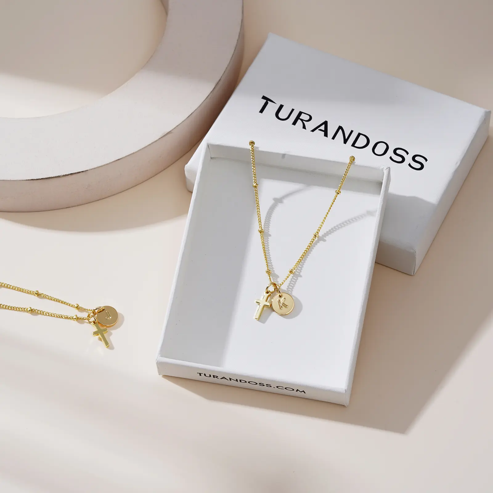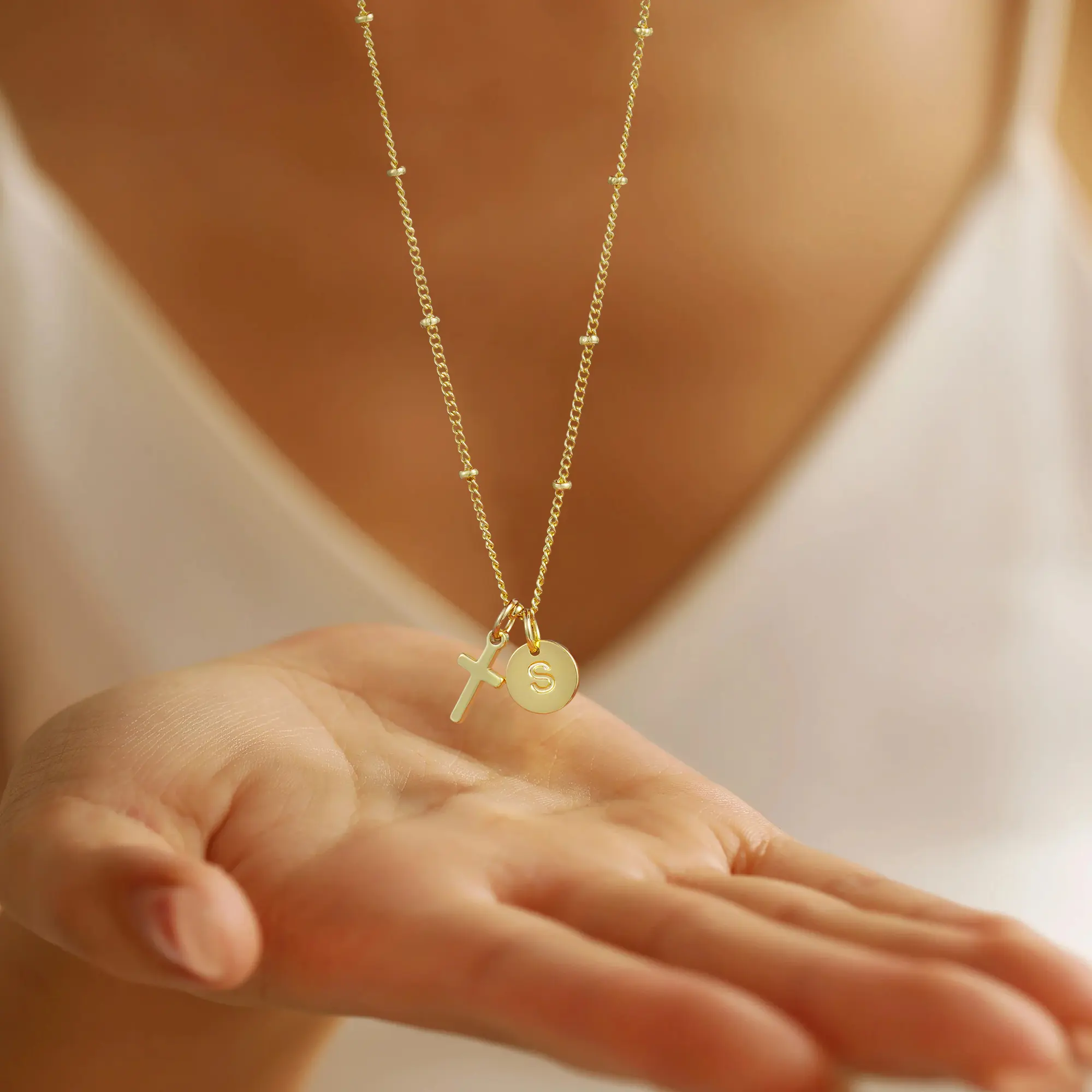 This timeless cross necklace pairs a classic 14K gold-plated cross with a delicate engraved initial disc, creating a meaningful blend of faith and personal identity. Symbolizing protection, love, and blessings, it’s a beautiful accessory for everyday wear and a heartfelt keepsake for anyone who cherishes faith-inspired jewelry.