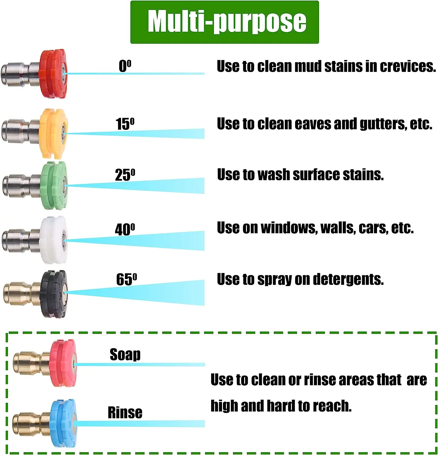 ·UPGRADED NOZZLES: Pressure washer nozzle tips have different spray angles. Power washer nozzle tips's orifice size is 3.0 and max working pressure is 4000 PSI. According to your need, you can choose a suitable nozzle. Extra pressure washer nozzle holder can prevent nozzle from losing, easy to carry and hang.