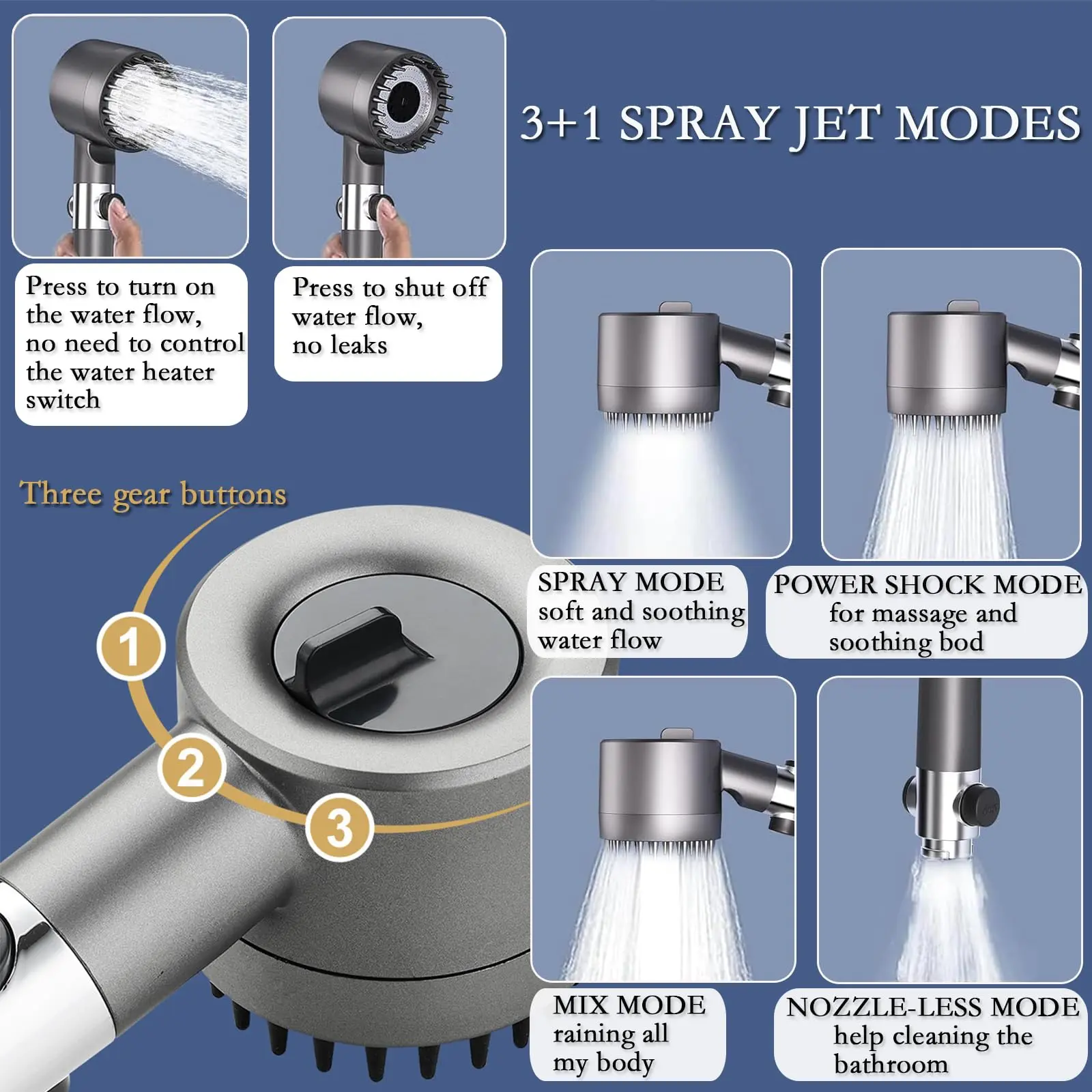 ·Adjustable Water Flow Modes: The Shower Head with Handheld and Filter offers four practical water outlet modes: Rain, Blend, Spray, and Clean.Easily switch between modes to customize your shower according to your needs.