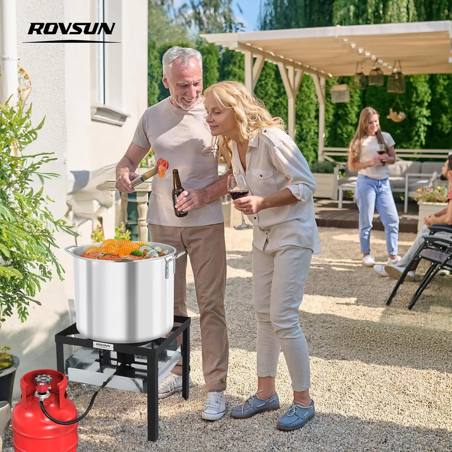 ROVSUN 80QT Turkey Fryer Seafood Boil Pot is equipped with 150000BTU jet burner for fast heating and cooking. And the surface of its stand is treated with heat resistant powder coating for durability. It also comes with accessories that makes cooking more convenient. Ideal for frying turkey or other food and boiling seafood.