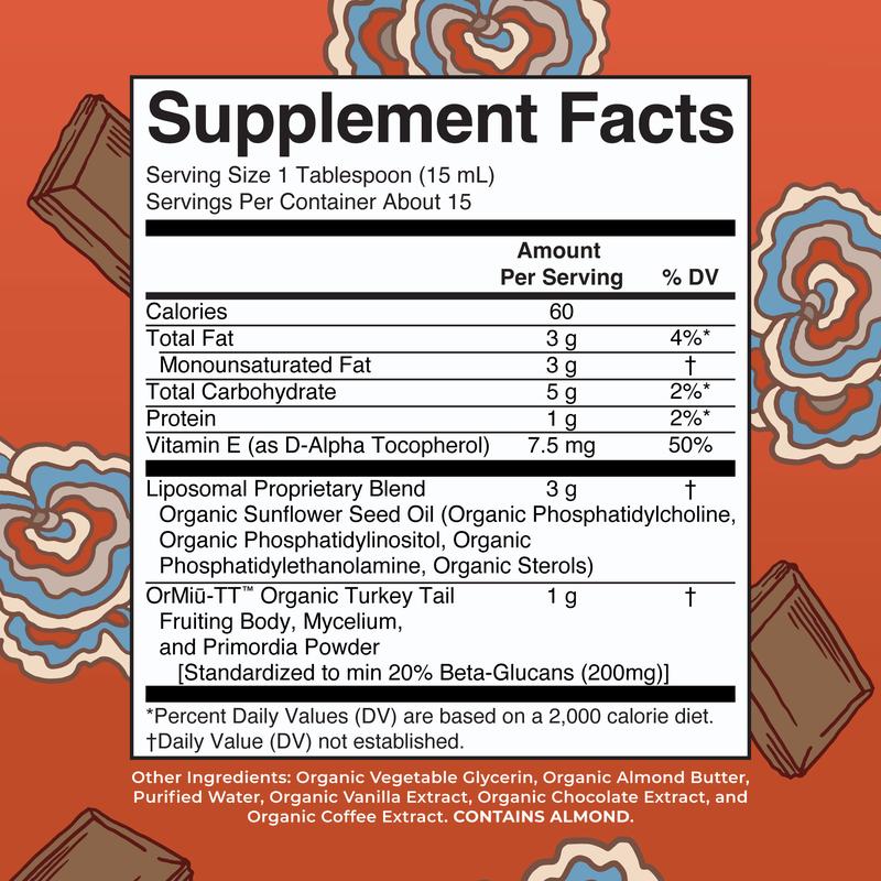 Enjoy this ultra tasty, ultra-absorption chocolate fudge flavored turkey tails liposomal with all mushroom parts included!