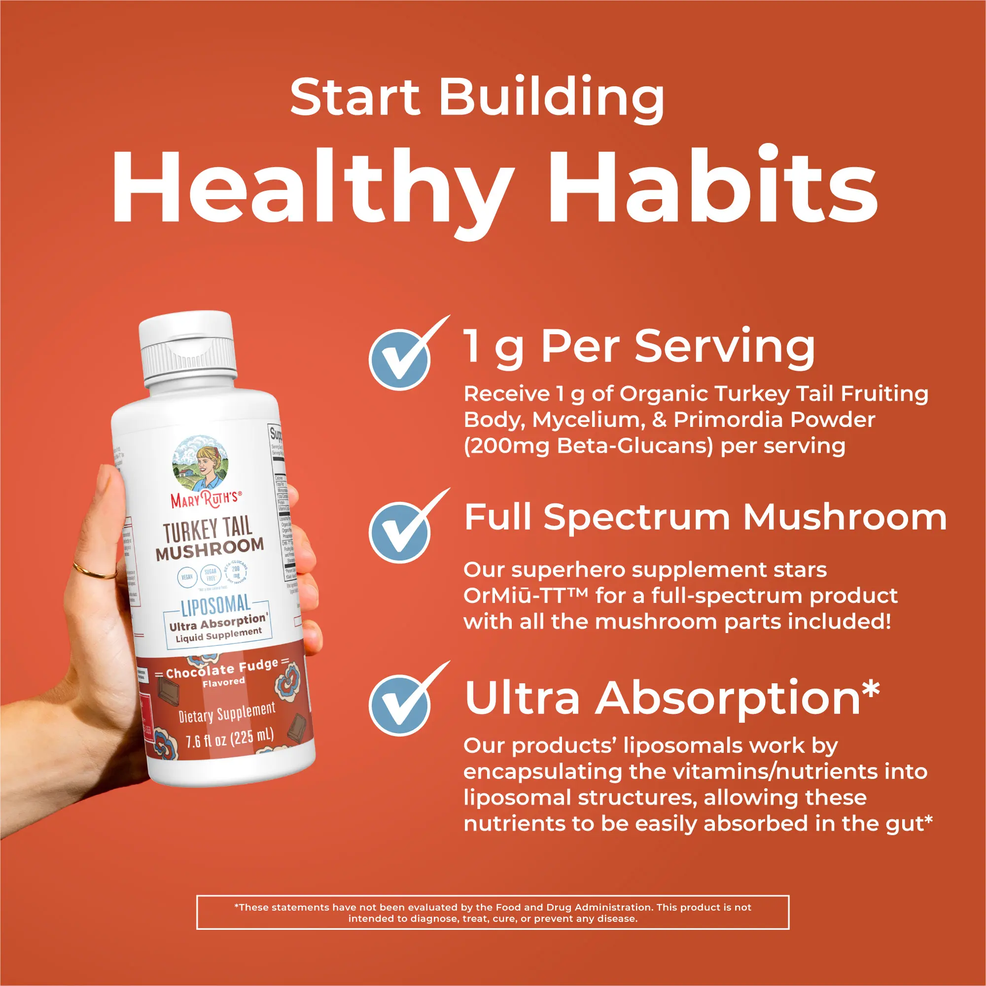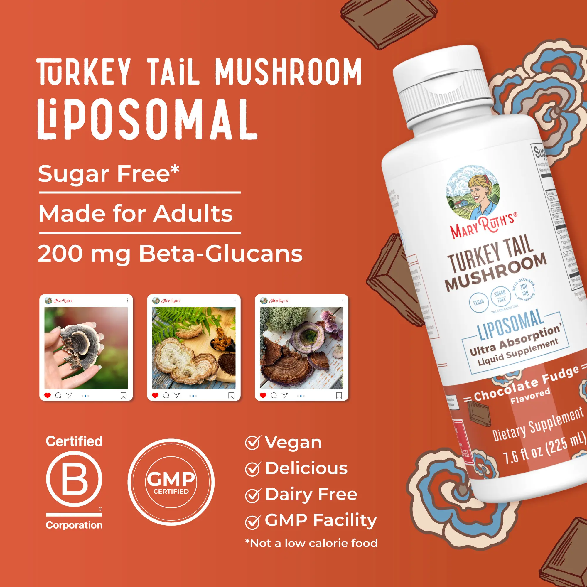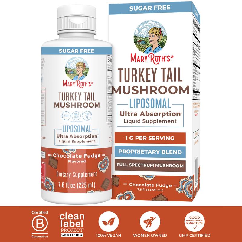 For Most Lifestyles: MaryRuth's Turkey Tail Mushroom Liposomal is Vegan, Dairy Free, Gluten Free, Soy Free, Sugar Free* (*Not a low calorie food). No Artificial Colors, No MSG, Made in a GMP Facility. This product CONTAINS nut allergens: Almond. B Corp Certified.