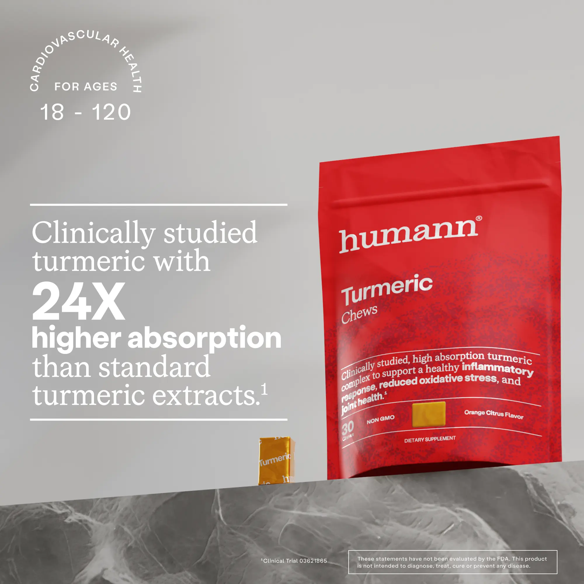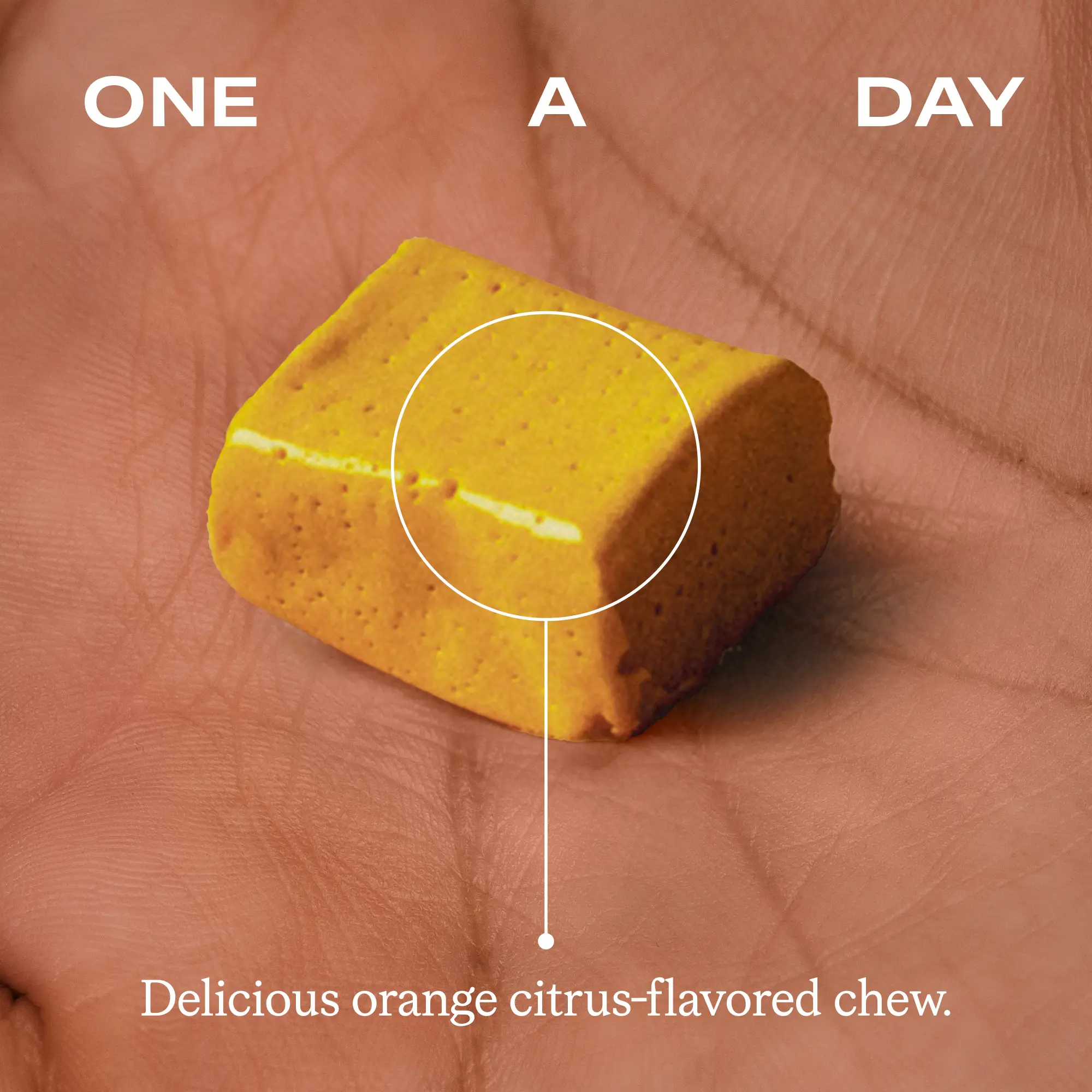 Featuring a high-quality turmeric curcumin complex that is clinically shown to deliver 24 times higher absorption into the bloodstream than your average turmeric supplement. This once a day, orange citrus chew supports:Β