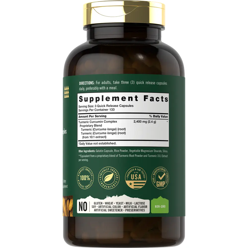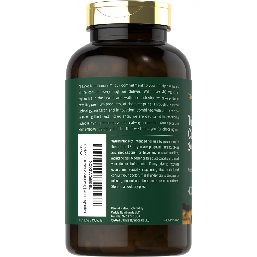 At Tahoe Nutritionals, our highly innovative formula features a Turmeric Curcumin Proprietary Blend equivalent to 2,400 mg per serving.* Quick release capsules are gluten free and non-GMO, made with no artificial flavor or sweetener, making it a perfect choice for adult men and women committed to top-quality nutrition. Enjoy or 400-capsule supply!