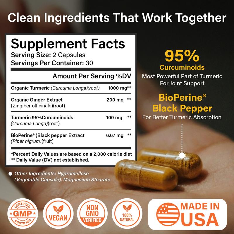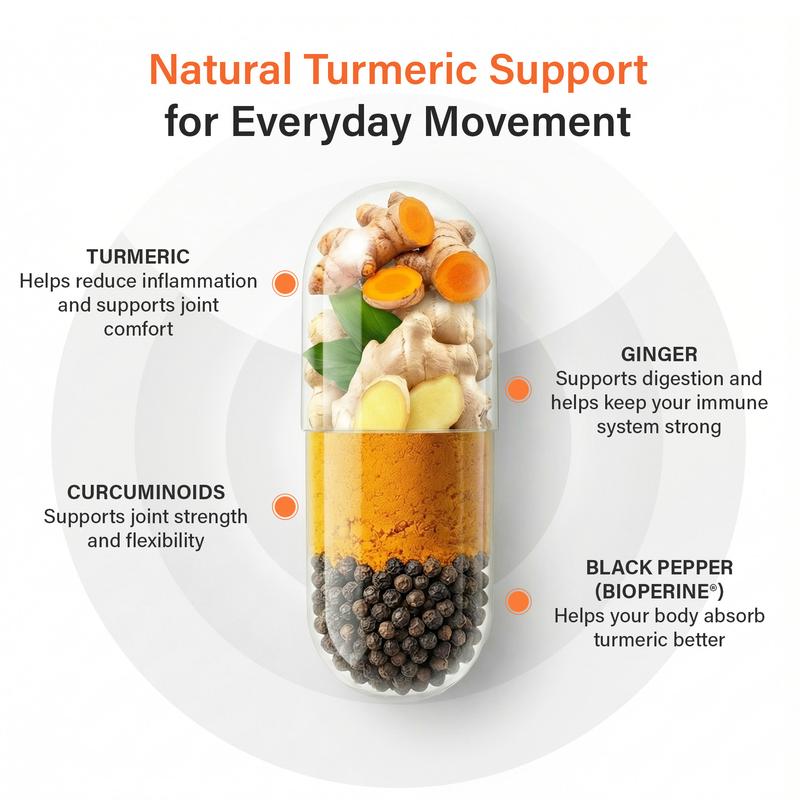 ·PERFORMANCE-DRIVEN TURMERIC FORMULA FOR ACTIVE BODIES: Powered by high-potency Turmeric + Curcumin (95% curcuminoids) with BioPerine and Ginger to support post-workout recovery, joint comfort, and mobility - ideal for athletes, gym-goers, and active lifestyles.