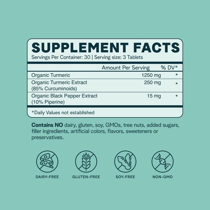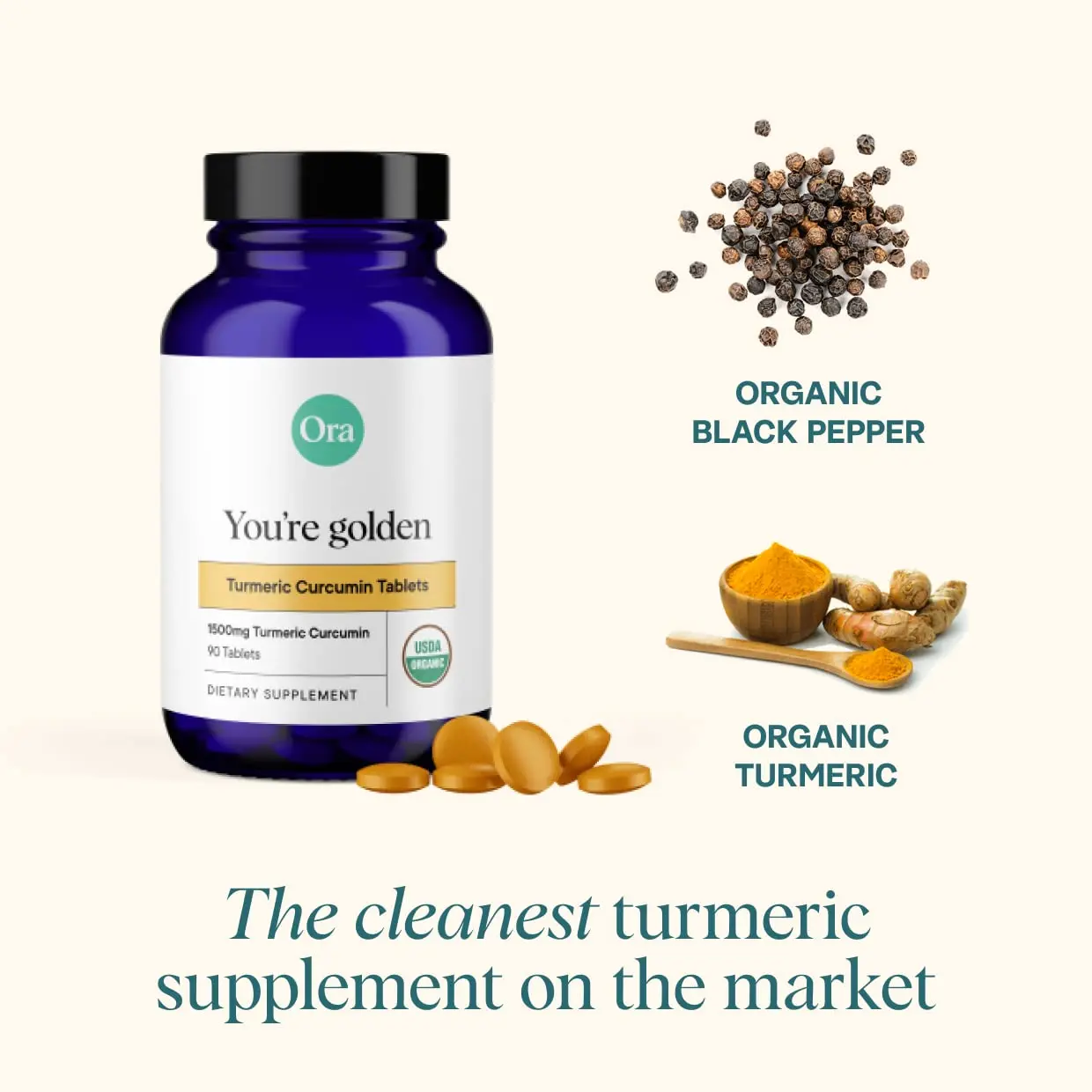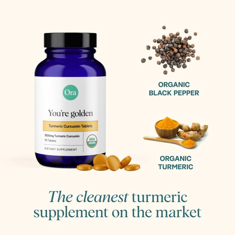 ·Clean, Vegan, Organic Ingredients: Made with Organic Turmeric Extract and Organic Black Pepper, and pressed to perfection in a no-filler organic tablet, Ora's You're Golden features just two ingredients and is the cleanest turmeric supplement on the market.