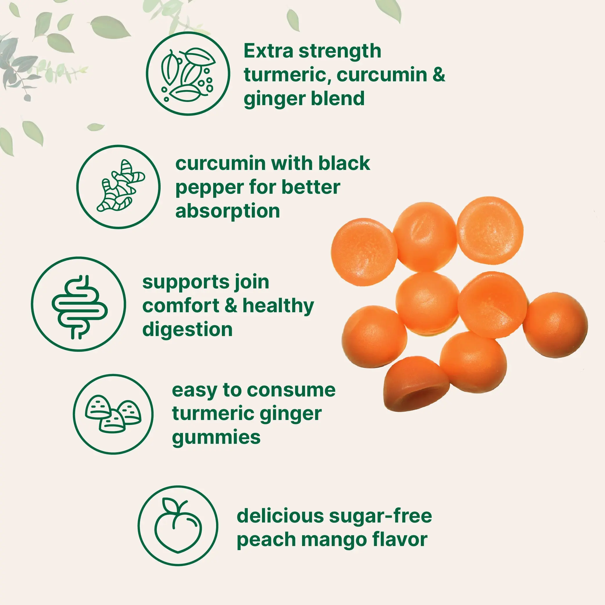 ·Micro Ingredients offers extra strength turmeric ginger gummies in a sugar-free peach and mango flavor. Each gummy combines a full spectrum of turmeric and curcumin extract with ginger, two traditional herbs valued for their supportive role in overall wellness.