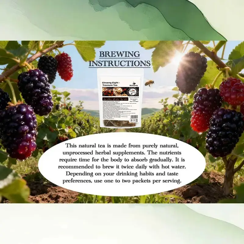 ·Taste & Texture: Babao tea Ginseng Eight Treasures Tea Kidney Tea has a strong taste and a sweet taste in the mouth. If you taste it carefully, you will have the aroma of Jujube, Mulberries and Ginseng. The color of Babao tea soup is deep and full of essence ingredients. Ginseng Tea is of good quality. Kidney tea organic cares more about men and understands men better. When you are tired, have a cup of Eight Treasures Tea.