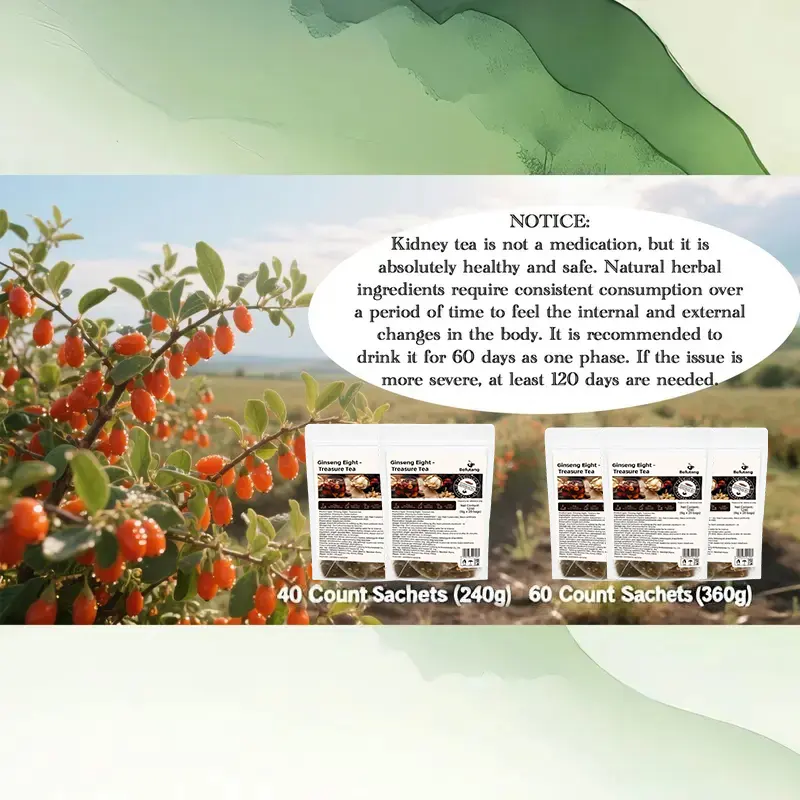 ·Natural Herbs: Kidney Tea Formula Ginseng 8 Treasure Tea Contains Ginseng, Wolfberry, Maca, Yam, Red Dates. Feel the difference for yourself as your body responds to the natural, gentle support of Tea.