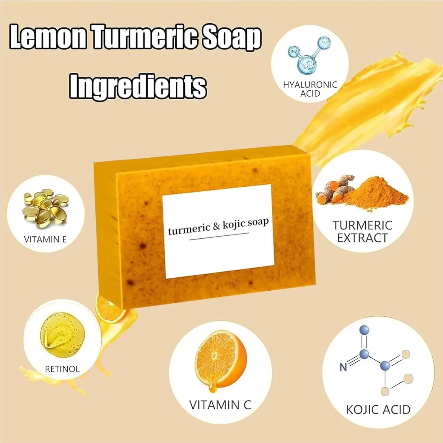 ✨ 3 Pack Turmeric Kojic Acid Soap Bars (100g) - Infused with Retinol, Hydrolyzed Collagen, Vitamin E & Shea Butter. These soap bars are gentle for face, body, and underarms. SLS-free, suitable for oily and dry skin. Perfect for those seeking a versatile soap solution.