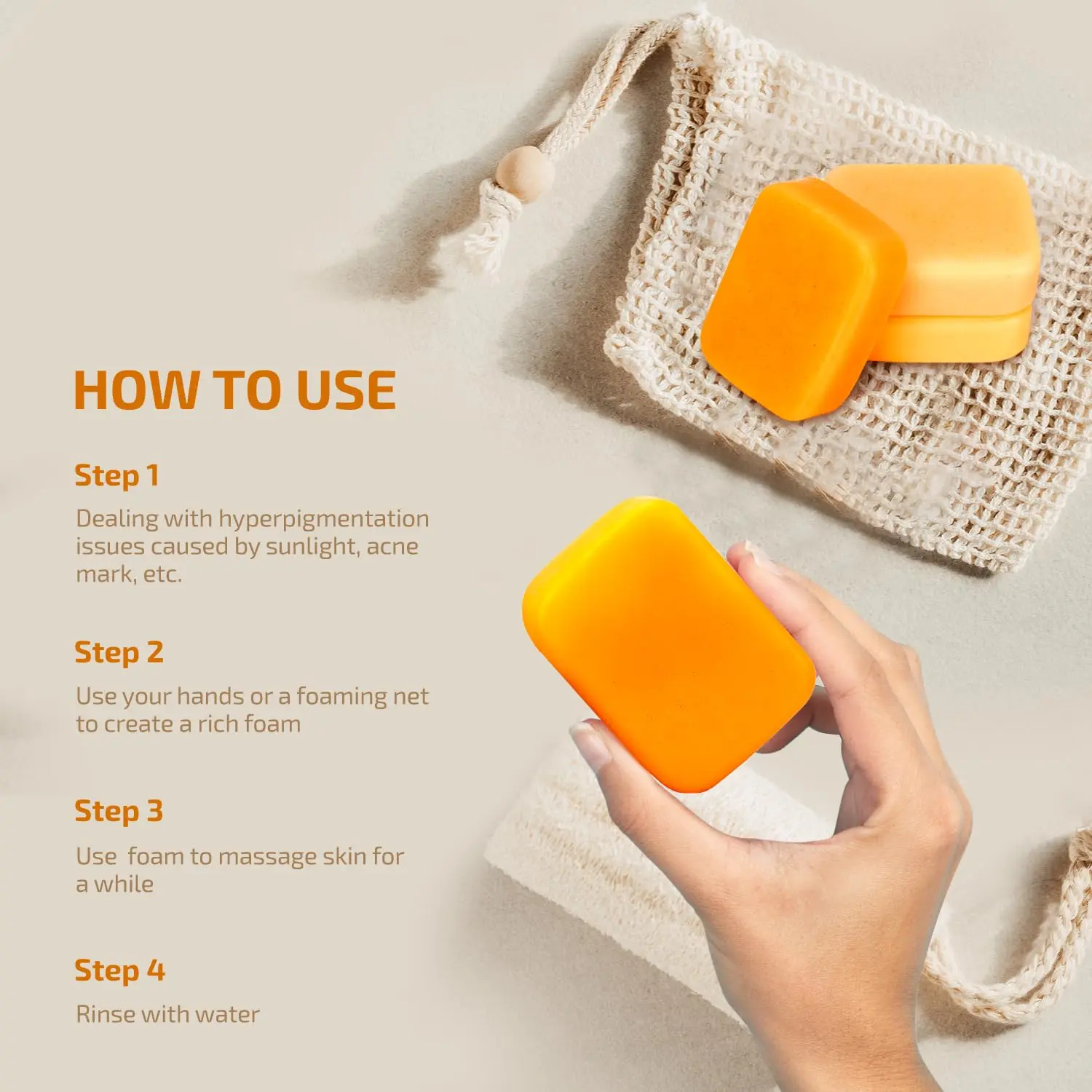 ·Rejuvenating, Exfoliating, and Nourishing Dark Spot Areas: First, wet your skin with warm water, and apply the turmeric soap evenly on the skin; Then, massage for 20-30 seconds, and finally rinse with water Use 1 or 2 times a day for the best results through the course of the soap that penetrates, and revitalizes your skin