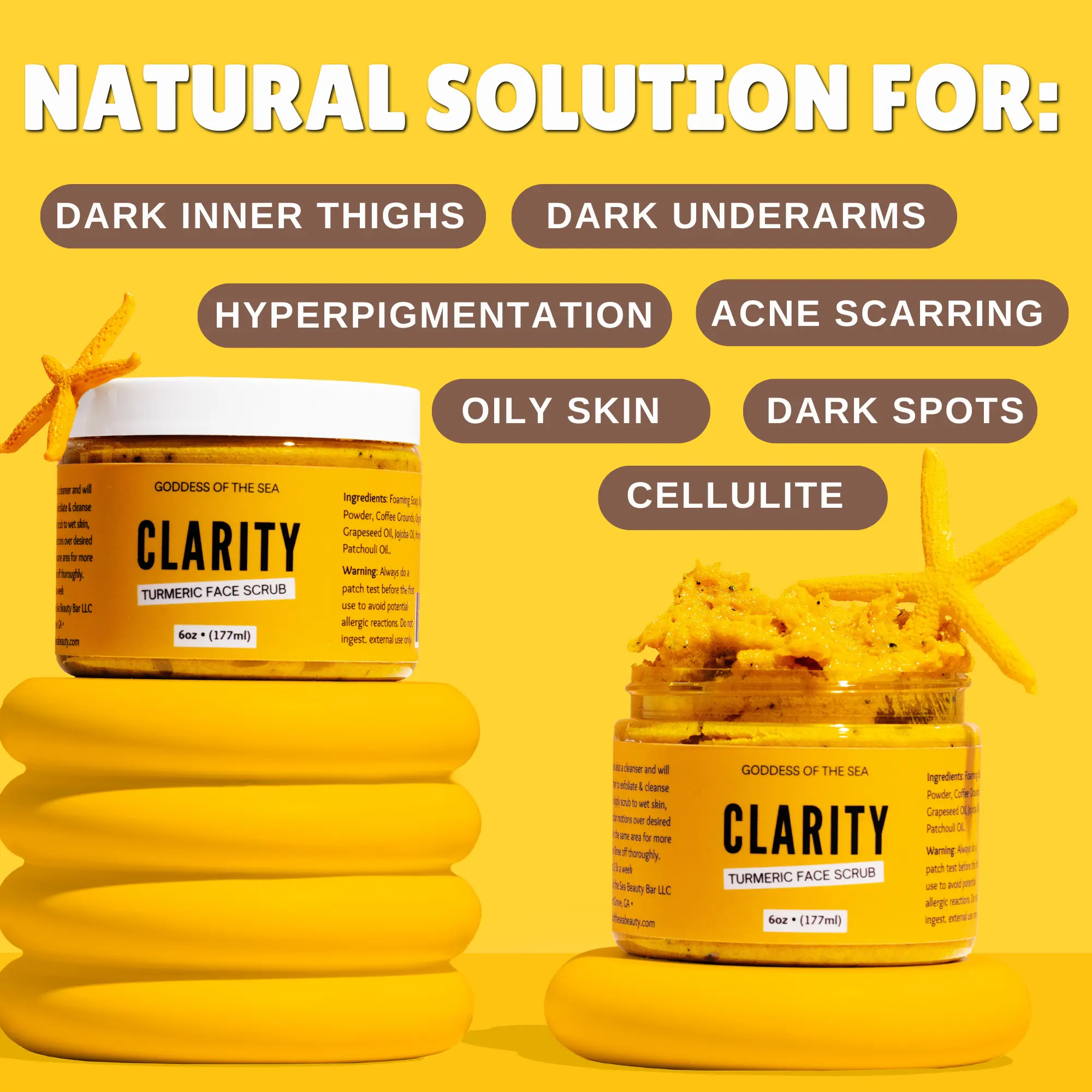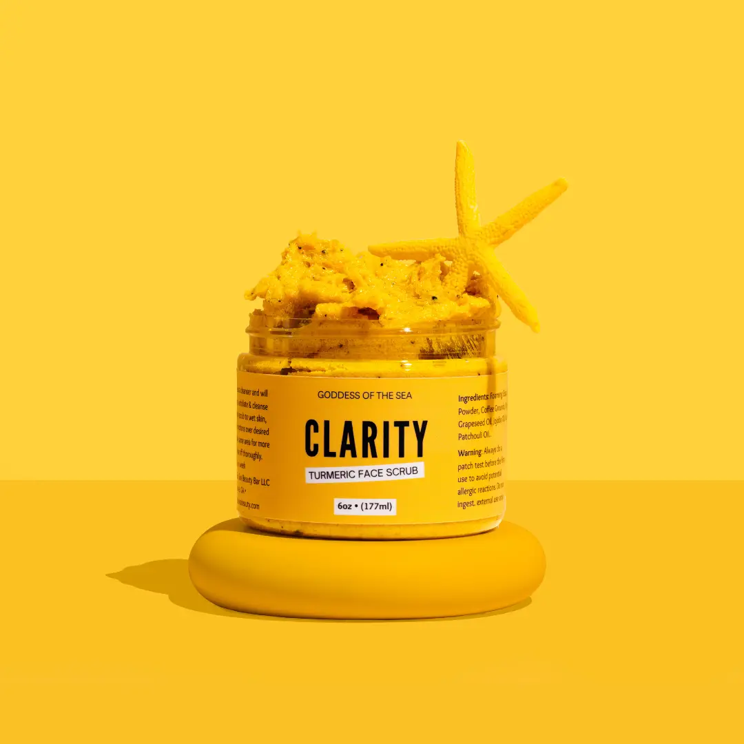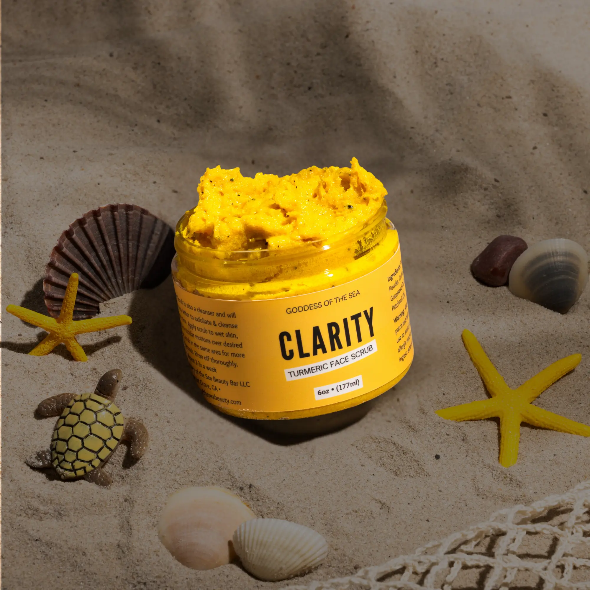 The Clarity Turmeric Scrub by Goddess of the Sea brightens and evens skin tone. It reduces the appearance of dark spots, hyperpigmentation, and dullness. The natural formula, powered by turmeric, helps reveal a smoother, more radiant glow. Perfect for face and body, it targets tough areas like underarms and knees without drying or irritation.