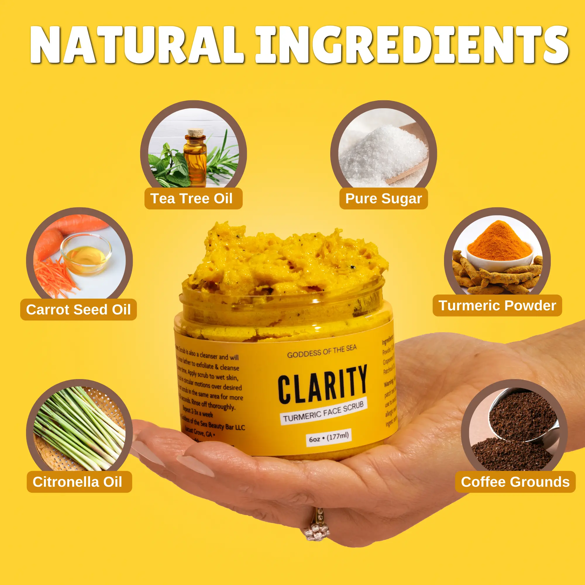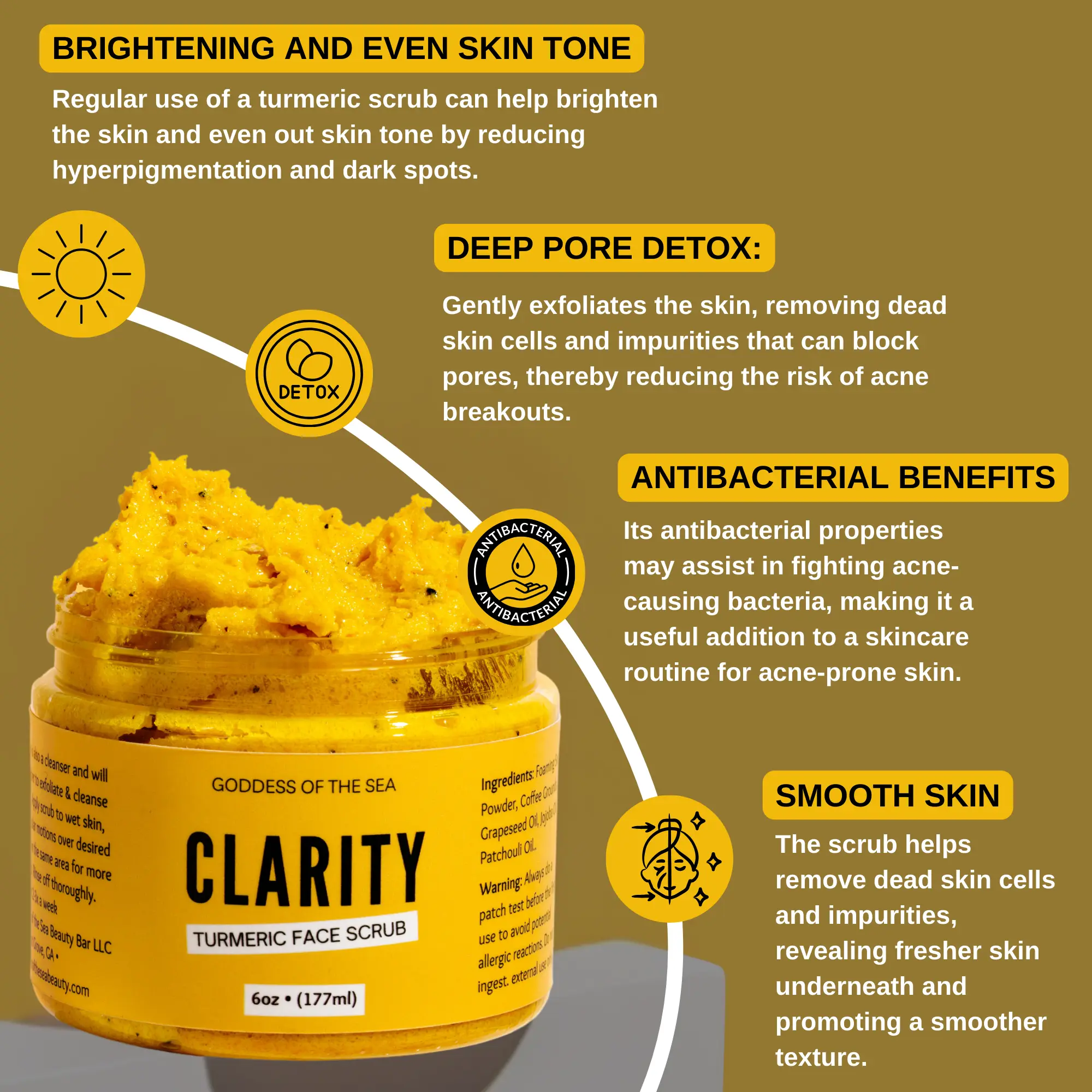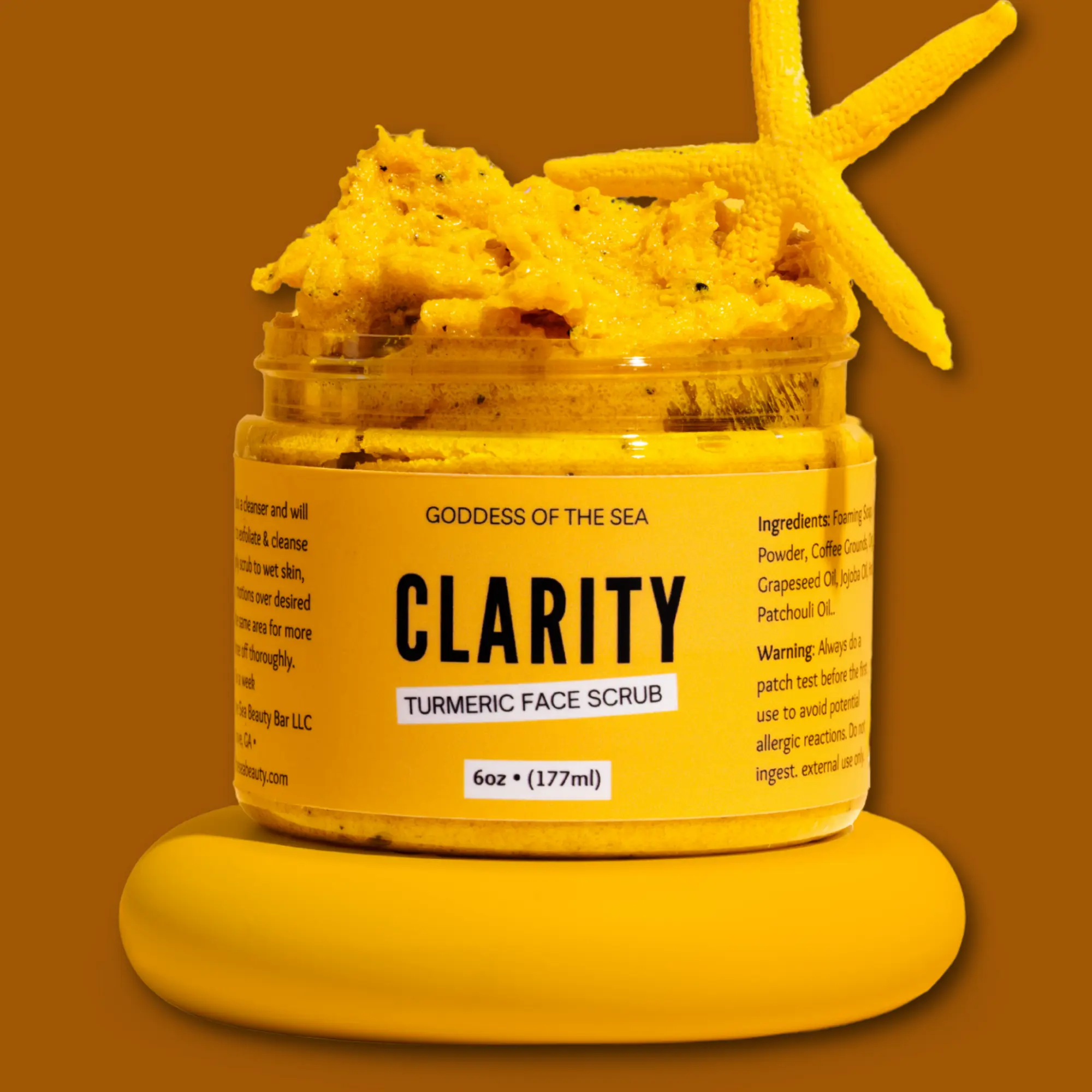 The Clarity Turmeric Scrub by Goddess of the Sea brightens and evens skin tone. It reduces the appearance of dark spots, hyperpigmentation, and dullness. The natural formula, powered by turmeric, helps reveal a smoother, more radiant glow. Perfect for face and body, it targets tough areas like underarms and knees without drying or irritation.