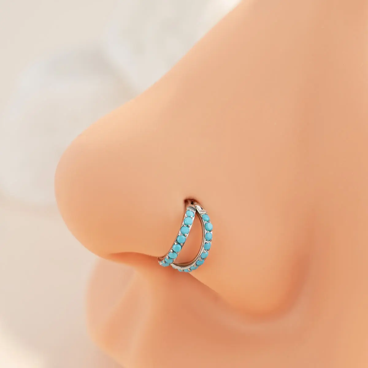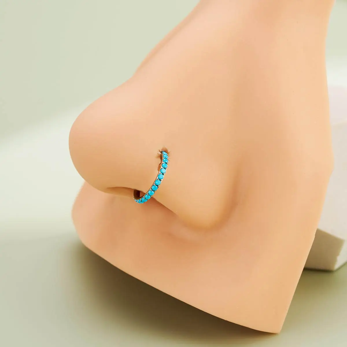 This turquoise nose ring is a charming and vibrant accessory that brings color to your nose piercing.