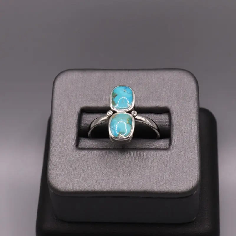 * Elegant Design: This ring features a sterling silver stone with a genuine turquoise. The stones are stacked, creating a very elegant appearance. Perfect for those who appreciate subtle yet sophisticated jewelry.