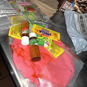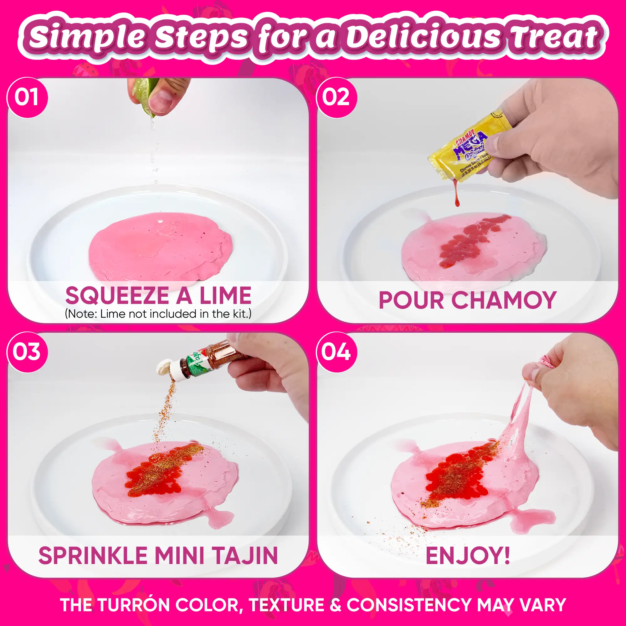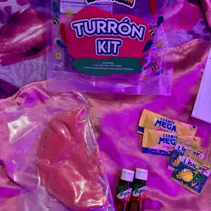 Experience a unique and flavorful treat with our Turron Kit, inspired by traditional Turron Rosa from Guadalajara. This soft, chewy dulce mexicano melts in your mouth and delivers a perfect balance of sweet and tangy flavors, enhanced when paired with chamoy, Tajin, and Limon7.