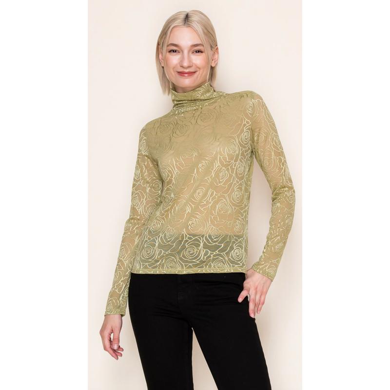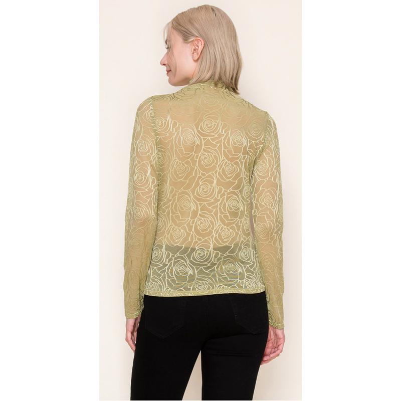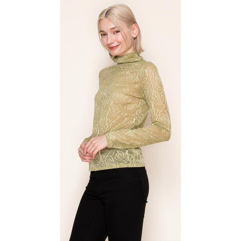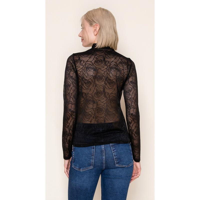 A long sleeve solid knit top with a mock neck featuring a floral mesh body and a true-to-size fit. Fabric is a lightweight knit.