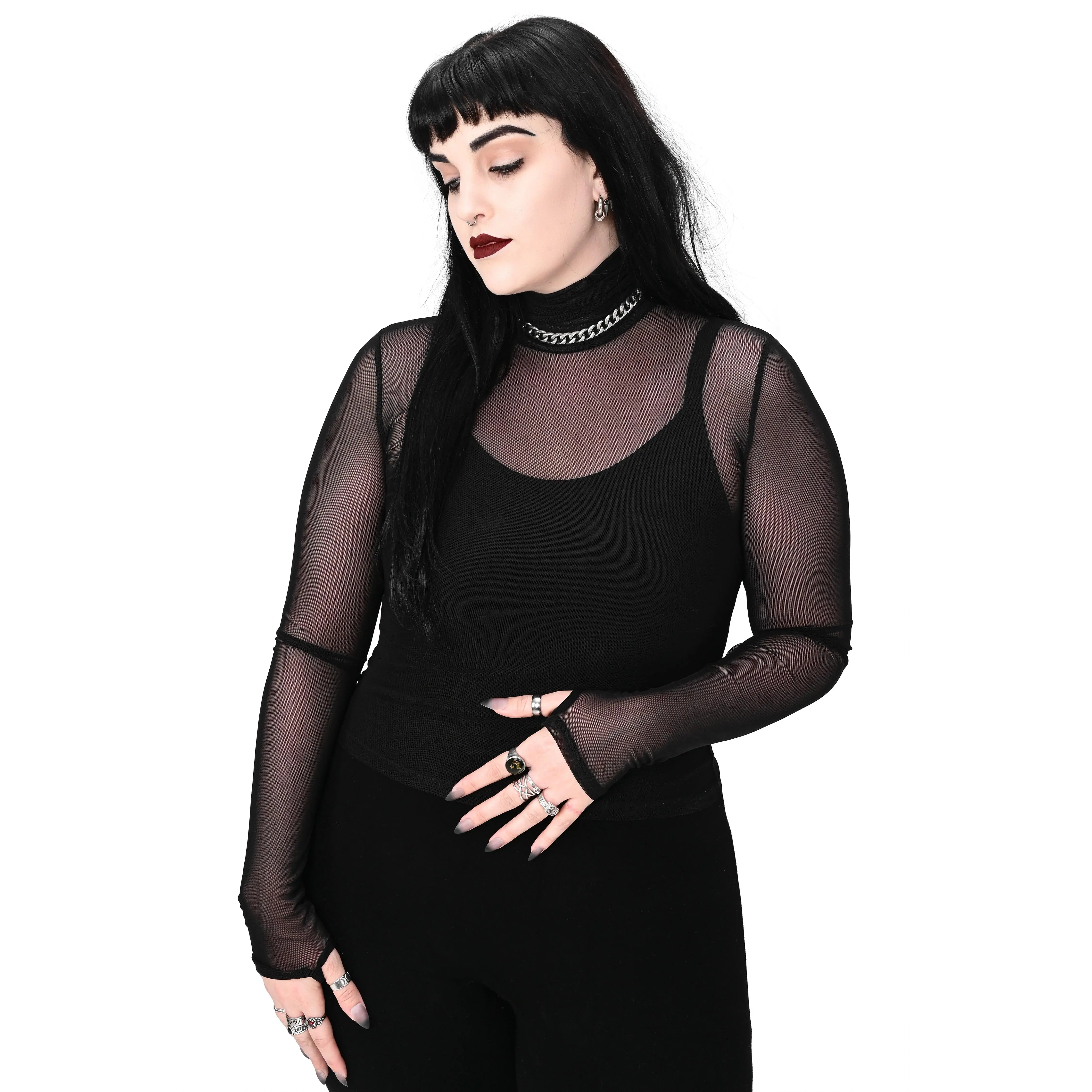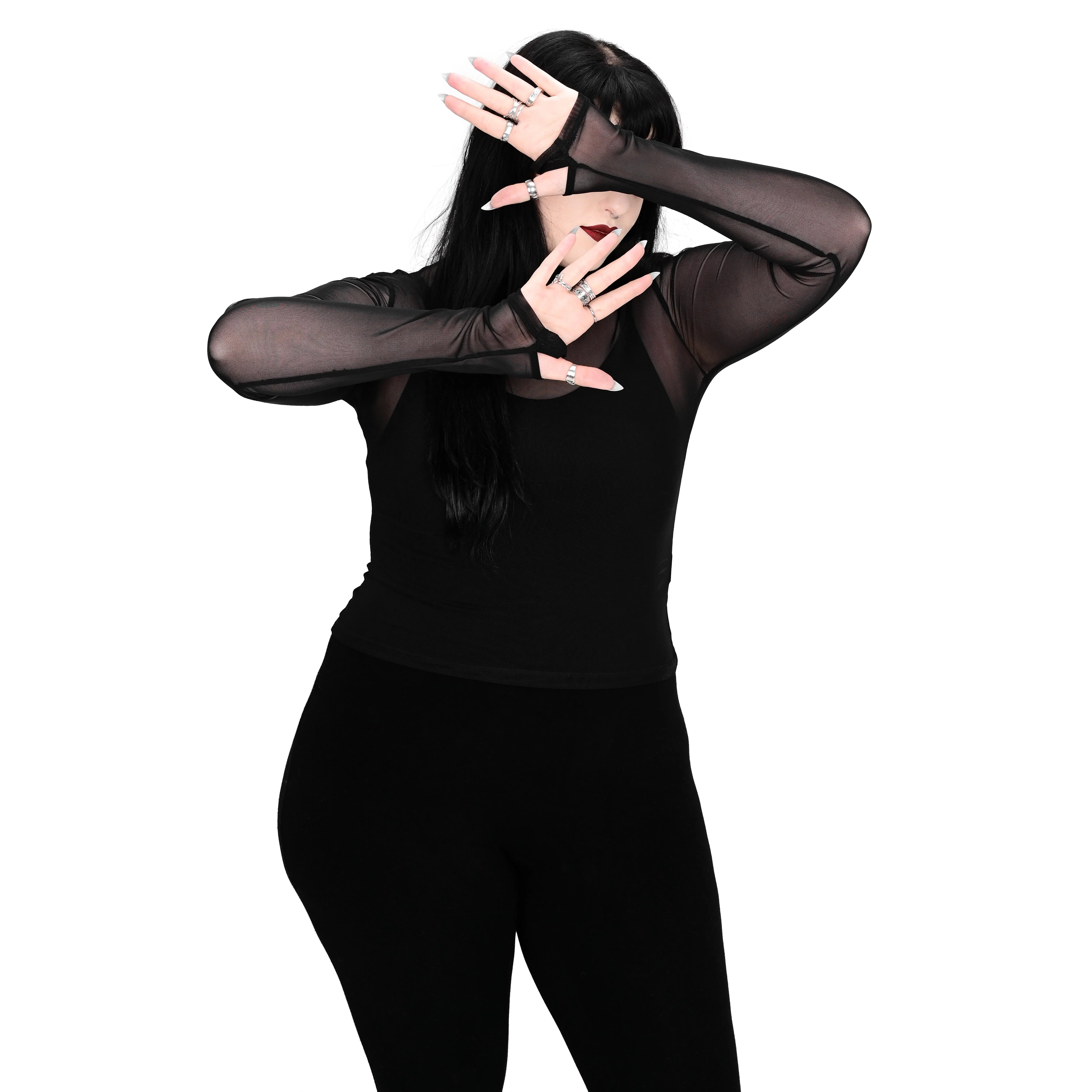 If you have a larger chest, I recommend sizing up because despite the stretch, the top will sit a little higher on your belly than at hip level. Iām obsessed with the thumb holes in this as an autistic goth girly who can stand when her sleeves roll up unintentionally. The fabric quality and the structure of foxbloodās clothes is just unbeatable. I remember buying my first piece and thinking āI really hope this is worth the priceā and being blown away once I received it. Everything is so versatile and the shade of black is ALWAYS consistent š„¹š¤