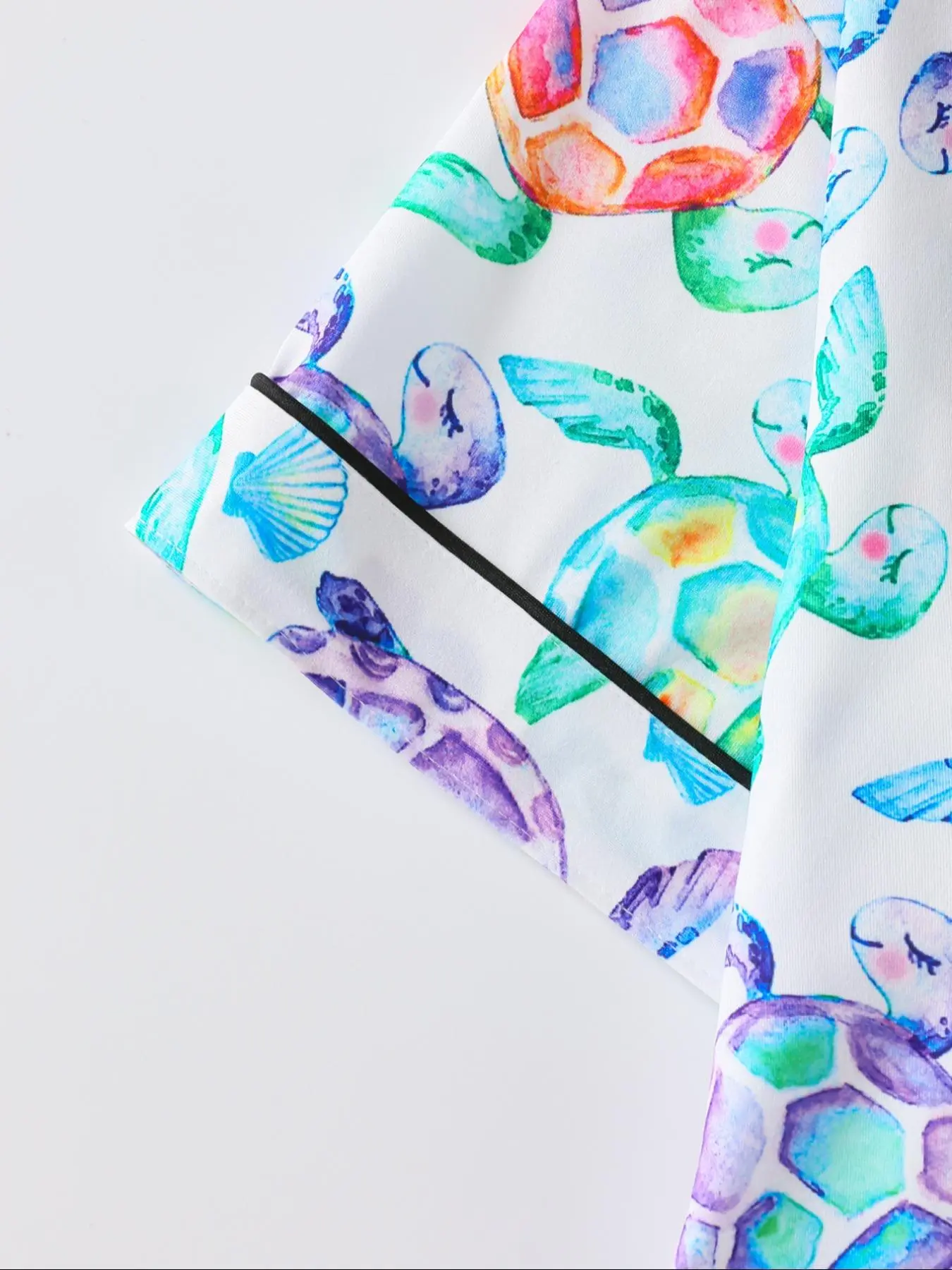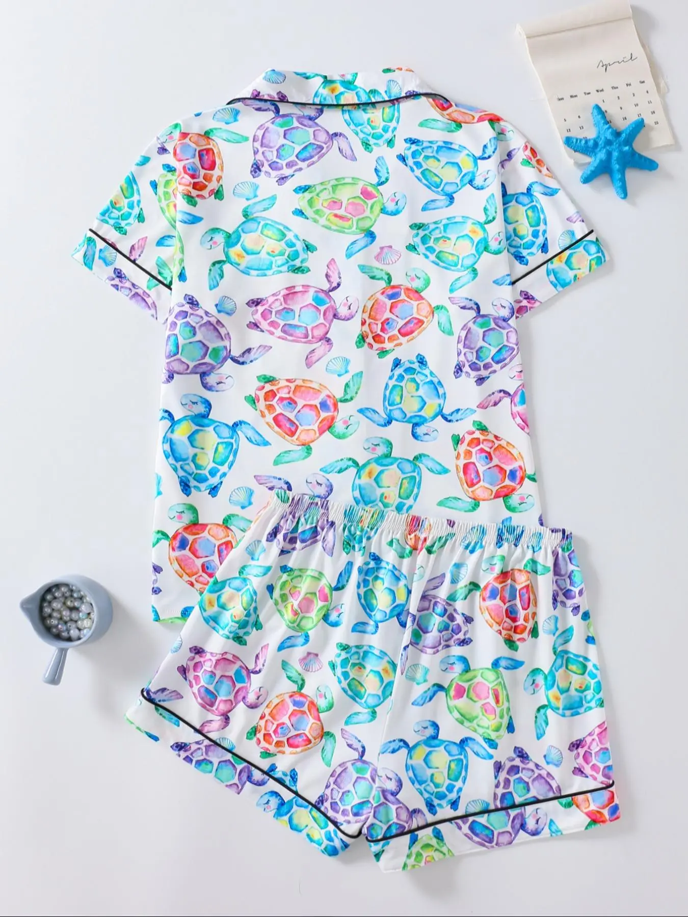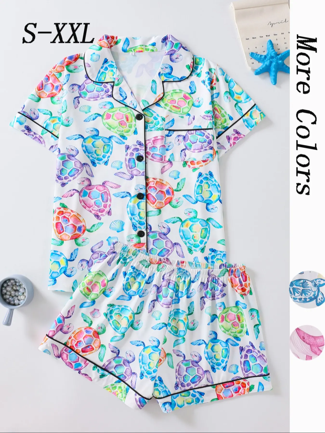 Exactly what I wanted! Plus,I love sea turtles So happy I purchased this Turtle Print Shirt & Short PJ set. Looks exactly as shown, colors are vibrant, true to size, comfy, stylish, I washed in cold water and hung up to dry, highly recommend this purchase 10/10