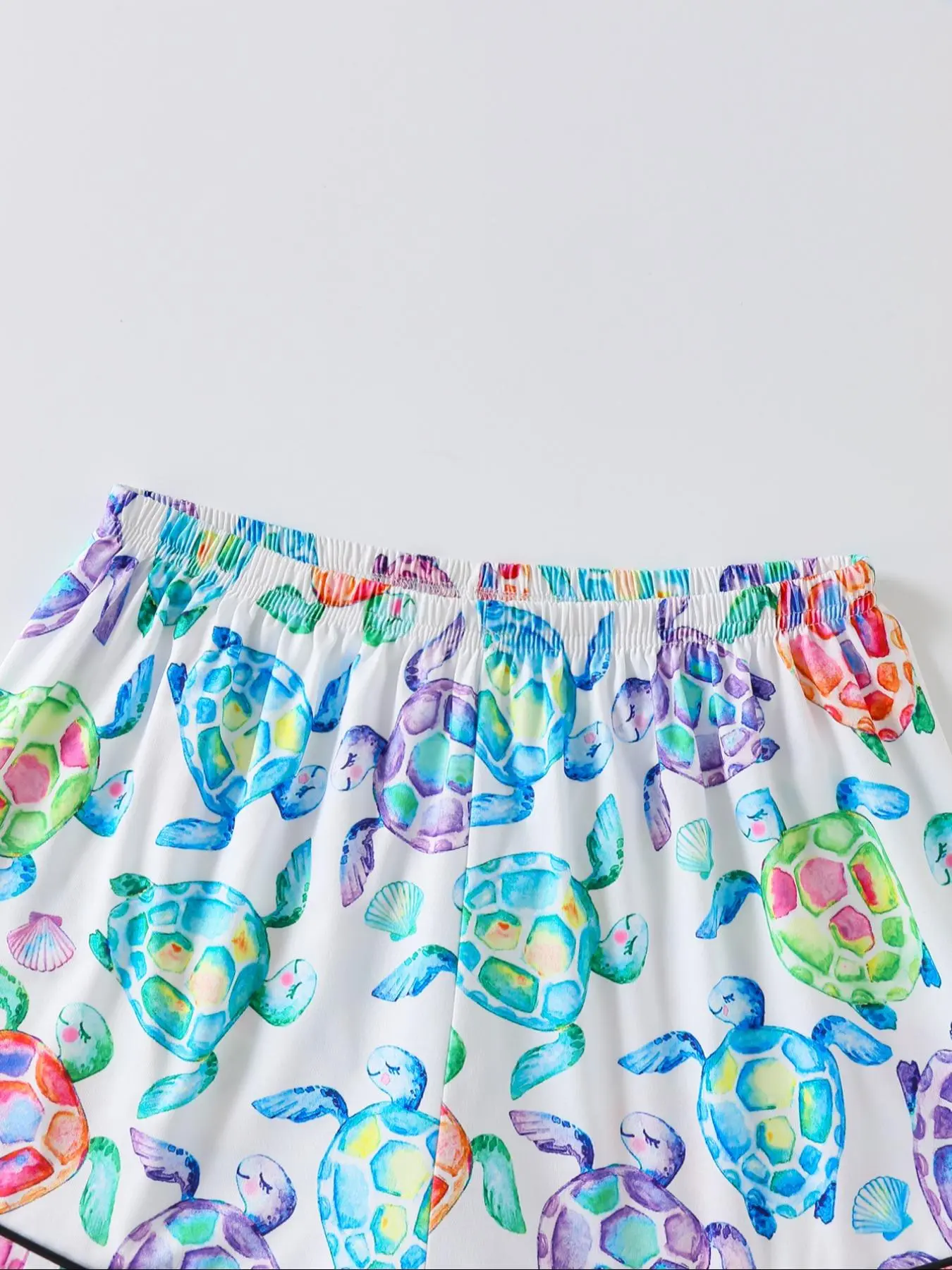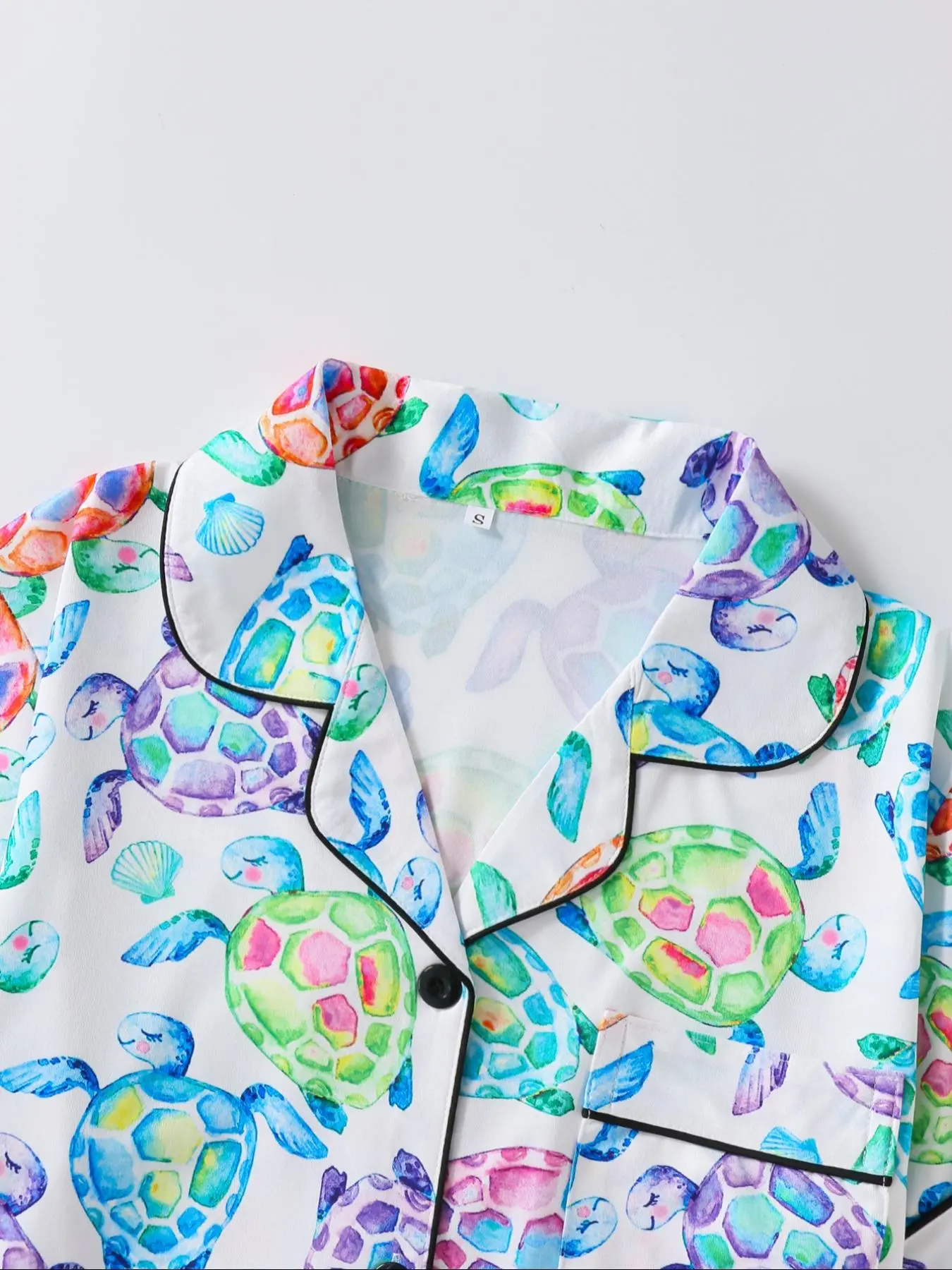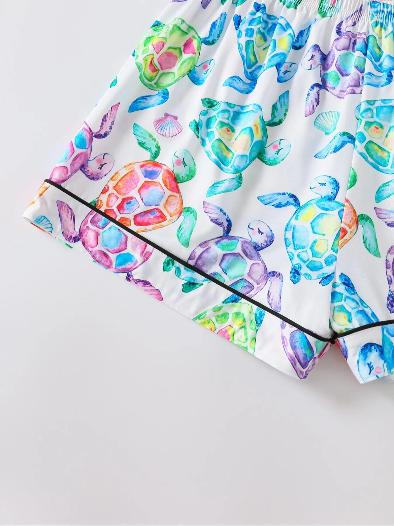Exactly what I wanted! Plus,I love sea turtles So happy I purchased this Turtle Print Shirt & Short PJ set. Looks exactly as shown, colors are vibrant, true to size, comfy, stylish, I washed in cold water and hung up to dry, highly recommend this purchase 10/10