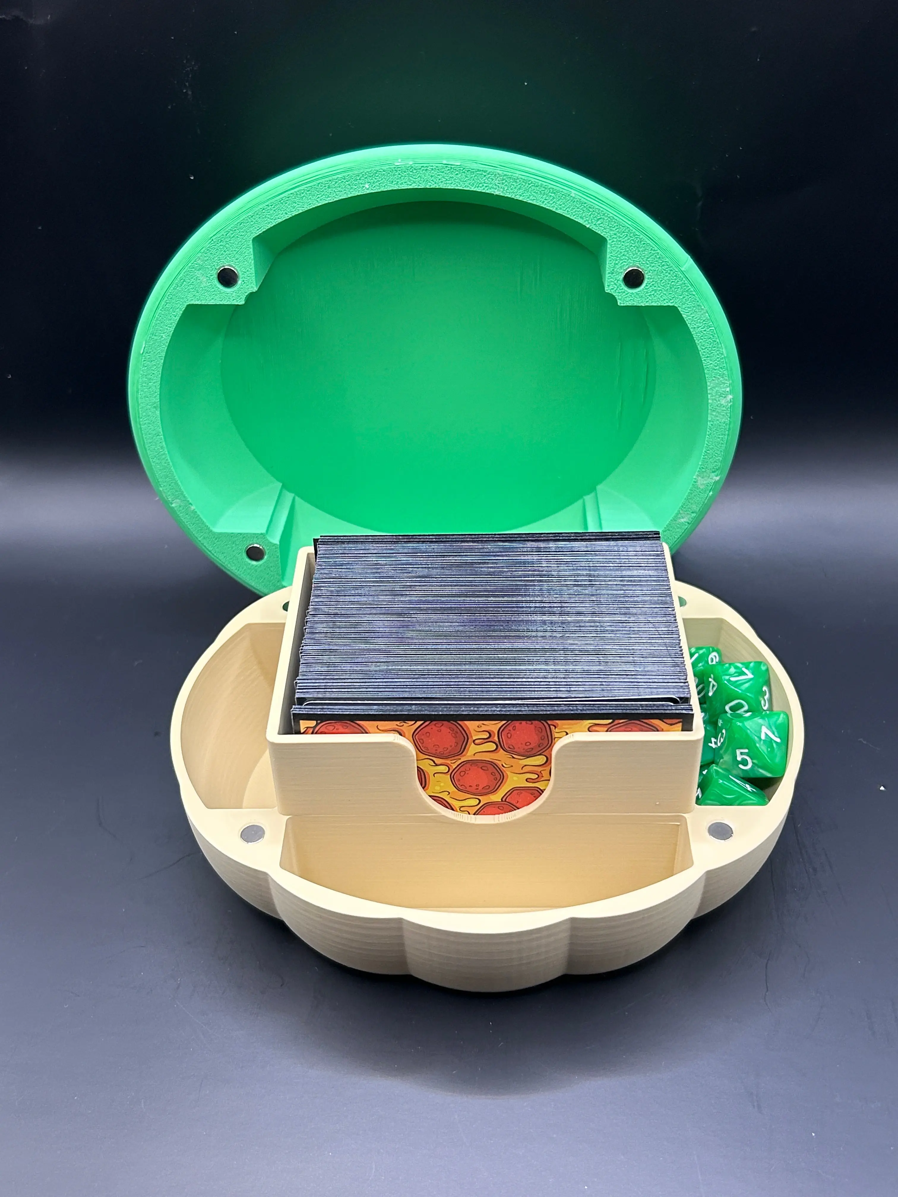 This deck box is perfect for any turtle themed deck (mutant or otherwise)! This allows you to easily and stylishly store and transport 100 sleeved card deck with extra room for storage!