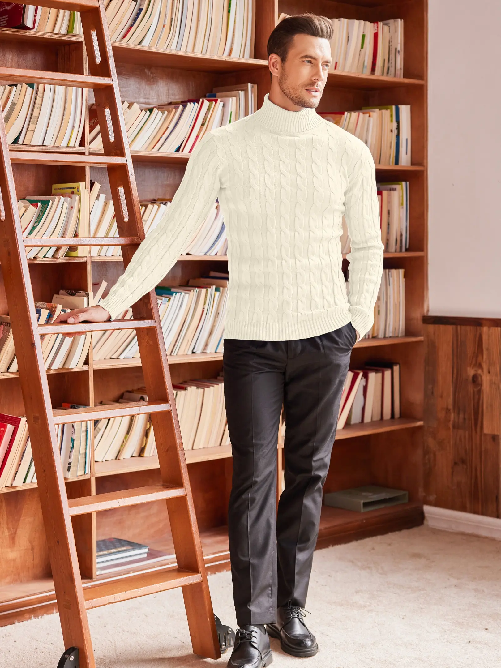 ·You can pair this cable-knit turtleneck sweater with sport coat or leather blazer/jacket for warm wear; Or you can just mary this chunky knit sweater with navy blue chino pants to create a smart casual look.