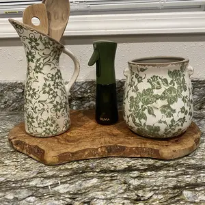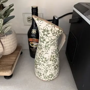 This ceramic pitcher is even prettier in person. The green vine pattern is elegant without being overwhelming, and the subtle distressed finish gives it a warm, vintage look. It has a nice weight to it and feels durable.
