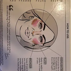 It’s the perfect makeup kit that has everything you need. The eye shadow colors come in 3 colors necessary for day time as well as night. I use more color for evening. The kit also includes a nice bronzer, blush & highlighter. There’s a picture that shows how to use the makeup. This is my 3rd purchase. It’s all I need to take on vacation. I definitely recommend.