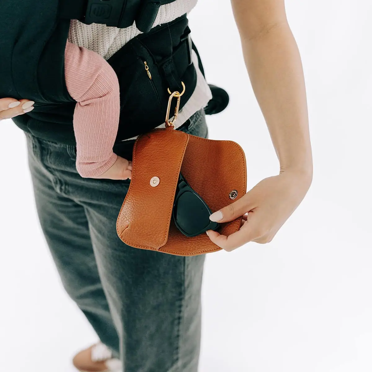 This soft-structured case protects your sunnies in style, with vegan leather and a gold clip that connects seamlessly to the D-rings on your Tushbaby gear. Sleek, durable, and easy to reach—because your everyday staples should look the part.
