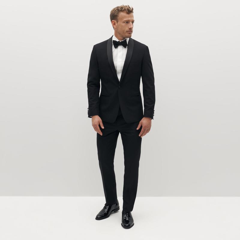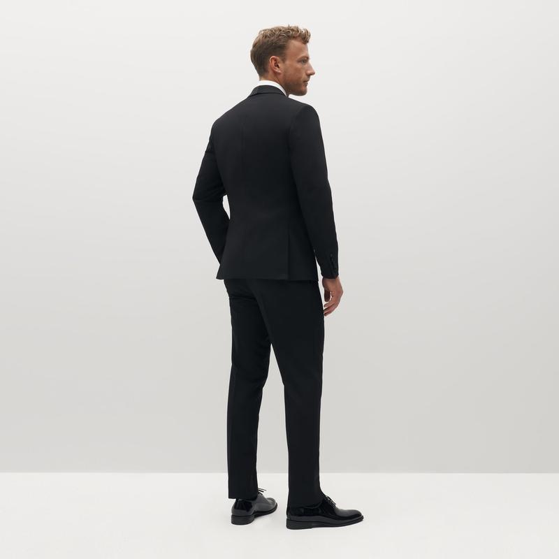 A twist on the black tux, this updated Black Shawl Lapel Tuxedo Jacket throws the expected a curveball. The rounded lapel look balances timeless style with contemporary tradition and flatters all frames. The satin detailing on the black tuxedo blazer’s shawl lapel finishes off a crisp, polished look. Signature Eco Stretch fabric construction with stretch where you need it and comfort where you want it makes this black tuxedo jacket with a shawl lapel a black tie go-to.