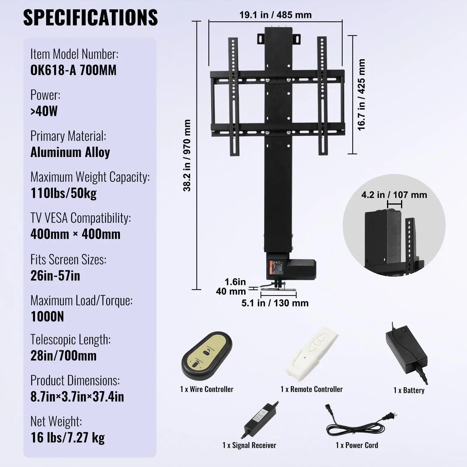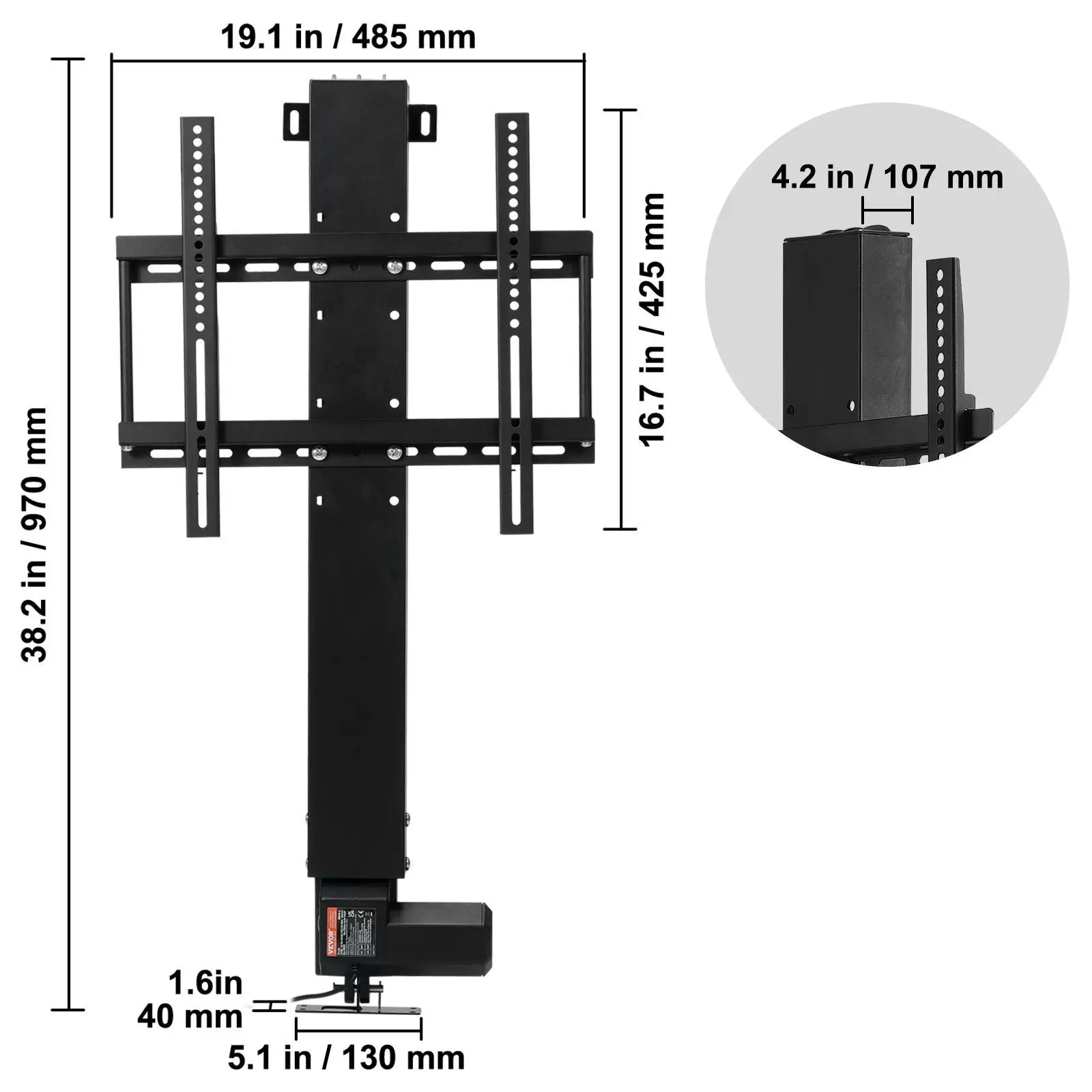 • Aluminum Alloy Structure: Length: 19''. Stroke Length: 19.7". Our motorized TV mount lift is made of quality aluminum alloy, ensuring durability and non-deformation. Relax to leave your TV to the stand.