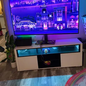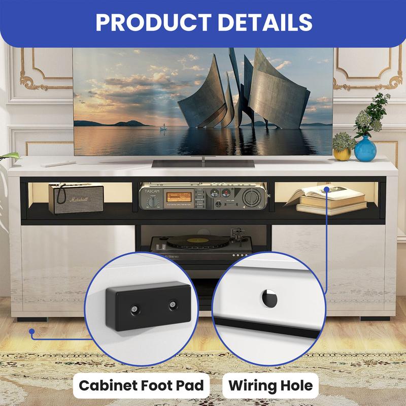Modern Elegance: DWVO TV stand blends classic white and black hues with modern LED lighting and a glossy finish, enhancing any home decor. Elevate your entertainment area with this stylish and functional piece
