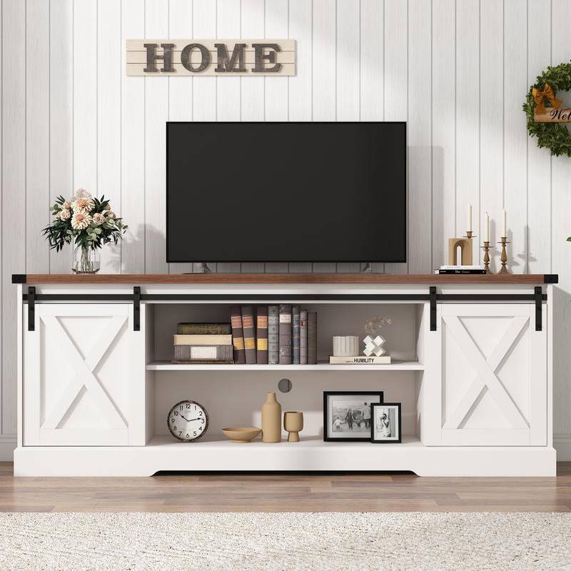 5. Farmhouse TV Stand for 70/75/80 Inch TV, 58/70 inch Entertainment Center Storage Cabinets with Sliding Barn Doors, Media Console Cabinet for Living Room, White/Grey/black