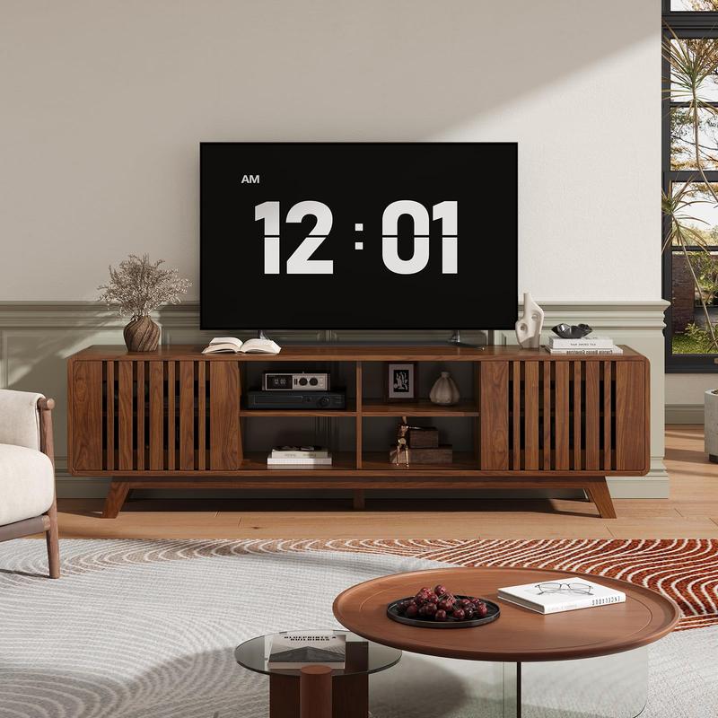 Elevate your entertainment area with this elegant mid-century TV stand, designed to seamlessly blend style with functionality. Featuring a warm walnut finish, smooth curved edges, and a distinctive sliding grille door, this piece effortlessly complements a variety of decors from modern to rustic. With a spacious design measuring 70"L x 15.7"W x 24"H, it comfortably supports TVs up to 80 inches and bears up to 300 lbs. The built-in power socket—equipped with 2 AC outlets, 1 USB, and 1 Type-C port—offers ultimate convenience, while adjustable shelves behind the grille door provide ample, organized storage for all your media essentials.
