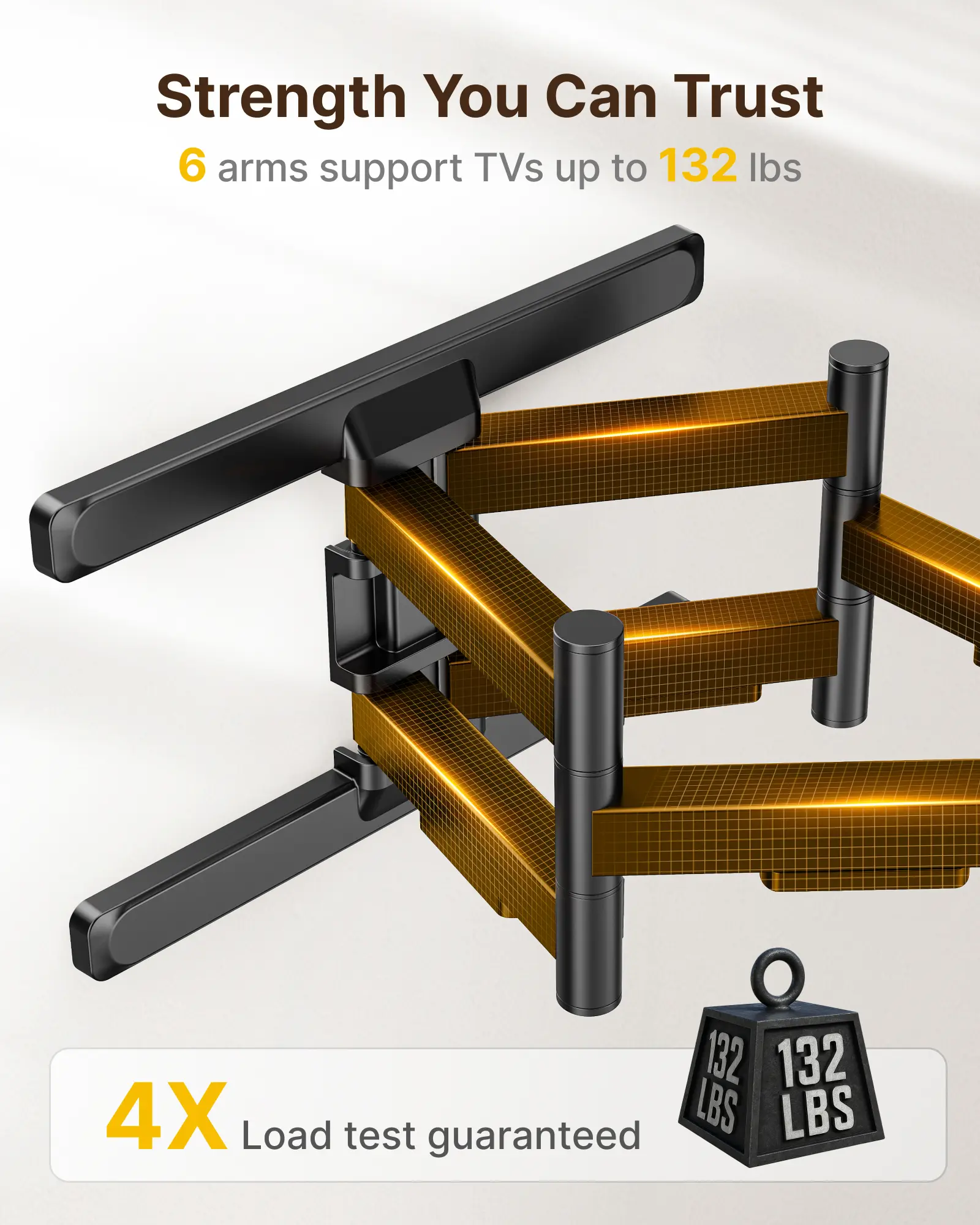 This isn’t your average TV mount — it’s built tough with 38% thicker dual arms and premium steel that can hold up to 150 lbs with ease. Every mount is 4× load tested, so your big-screen OLED, QLED, or LED TV stays safe and rock-solid no matter what.