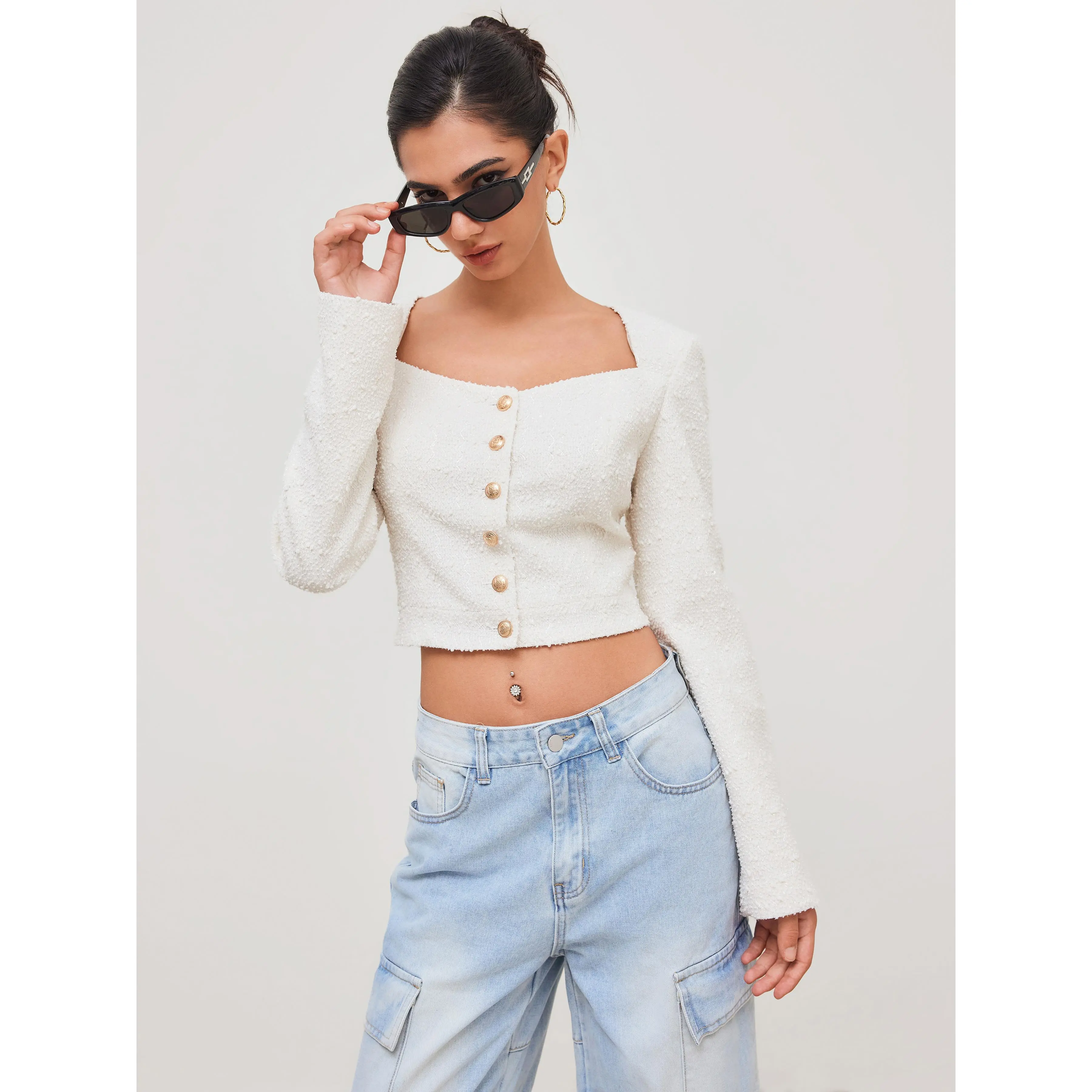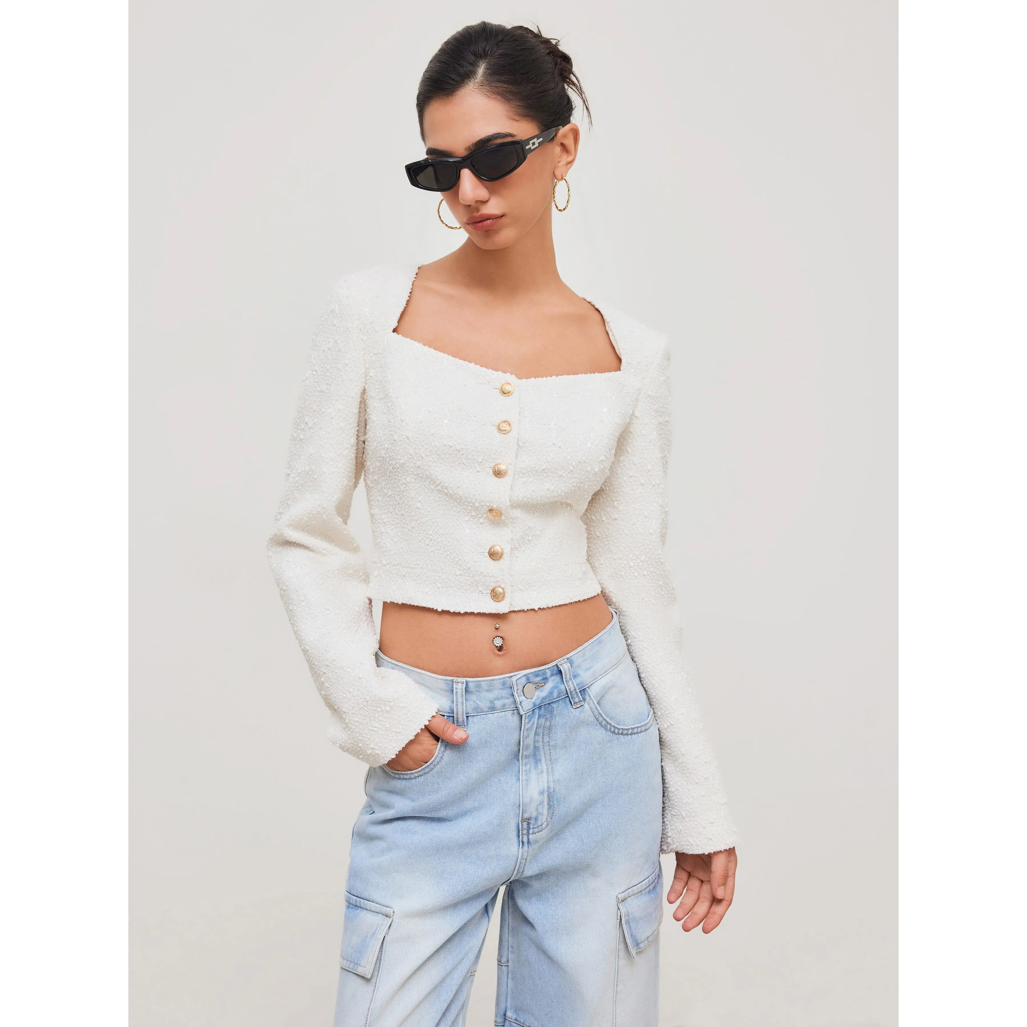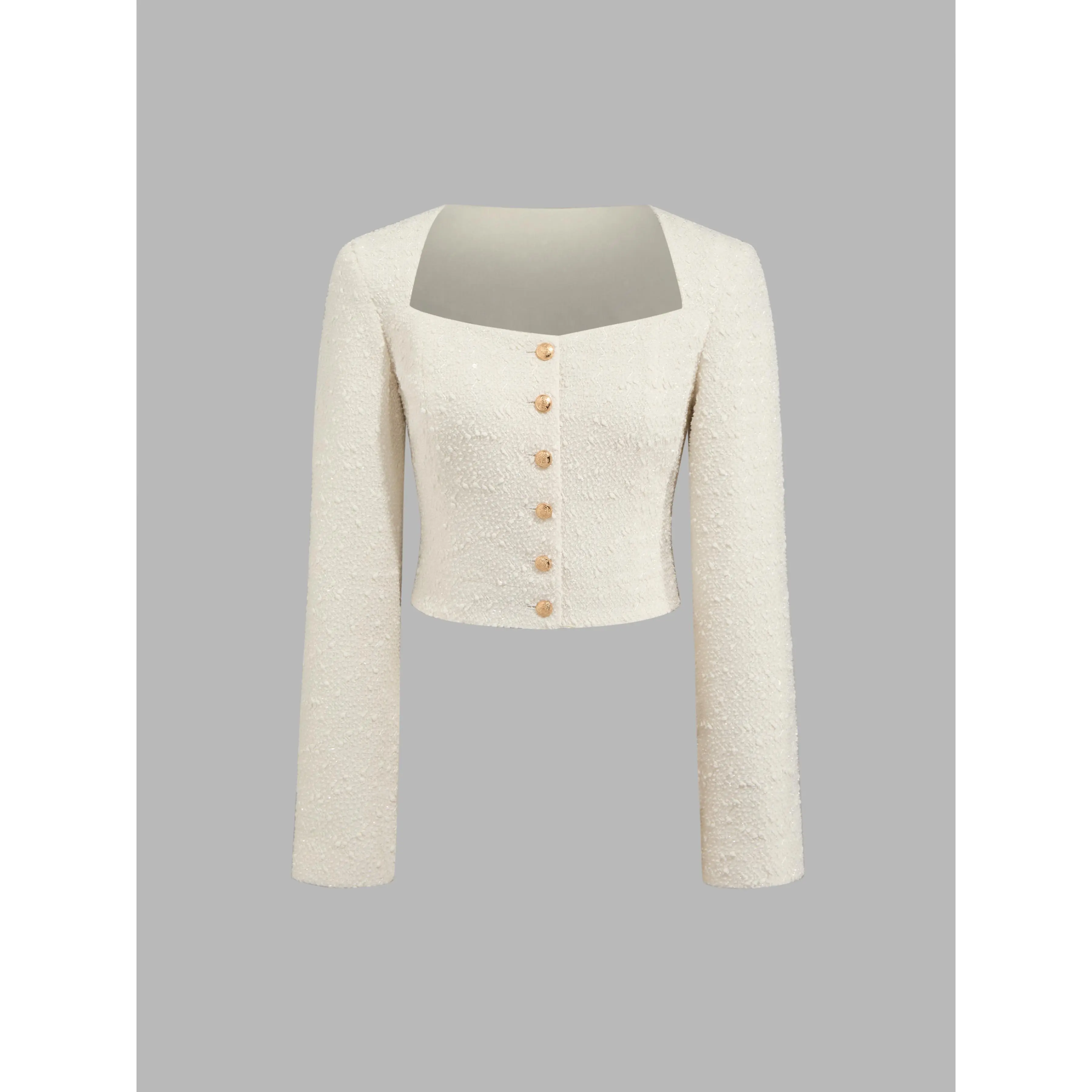 5. Cider [size 2-10] Tweed Square Neck Solid Button Crop Jacket