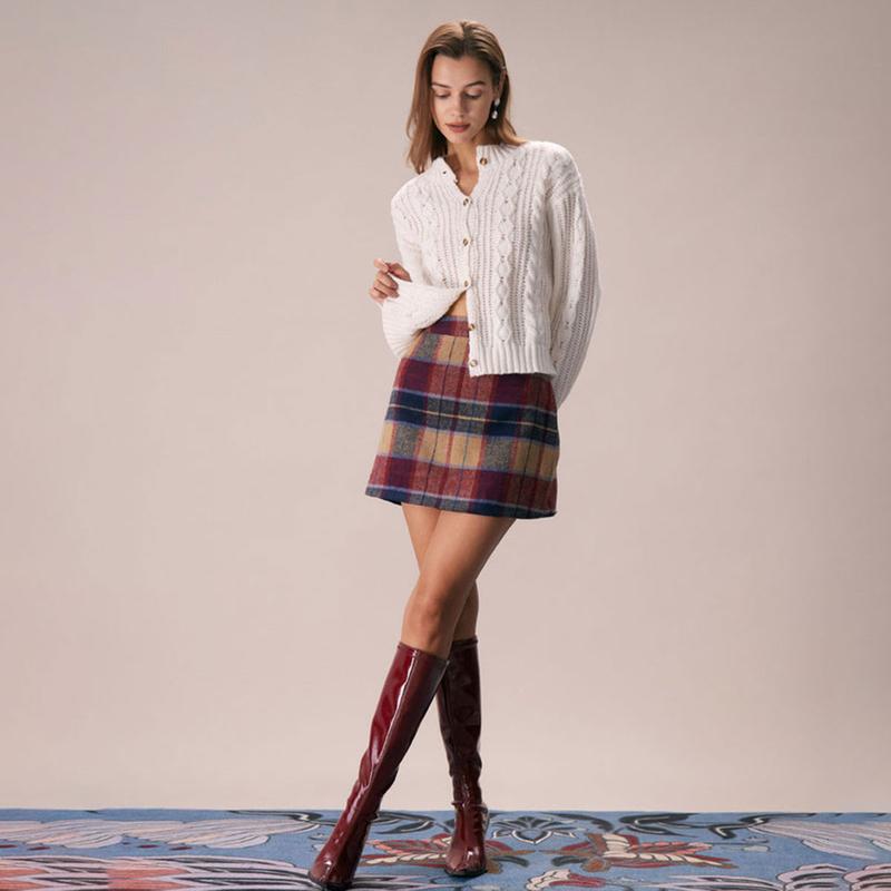 Description: This Tweed Skirt is a versatile piece that combines feminine style with modern comfort. The plaid and tweed detail adds a touch of elegance and pairs well with a variety of tops. The zipper fly and natural waisted design create a classic silhouette with a modern twist, perfect for any occasion. Whether dressed up with heels or dressed down with sneakers, this skirt is a must-have addition to any wardrobe.