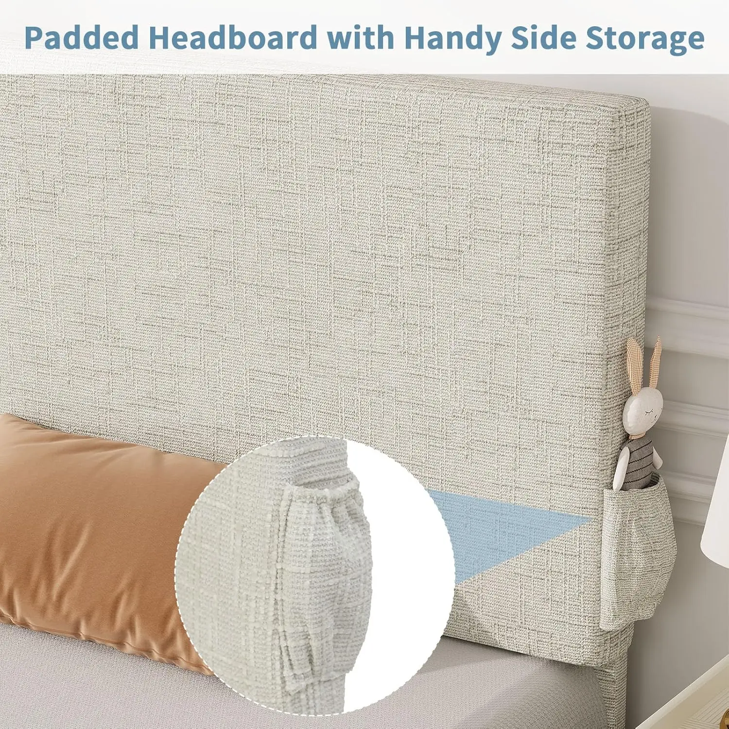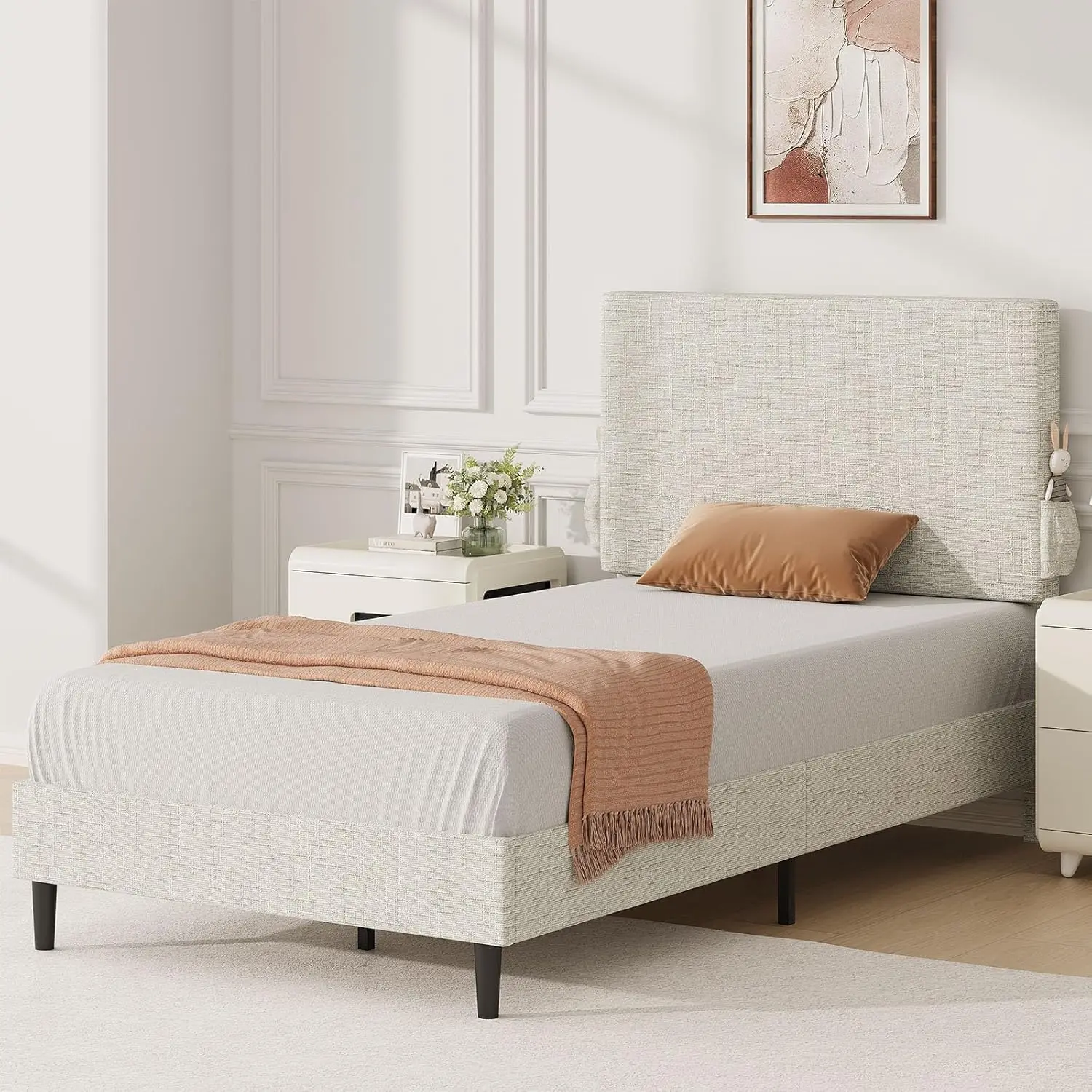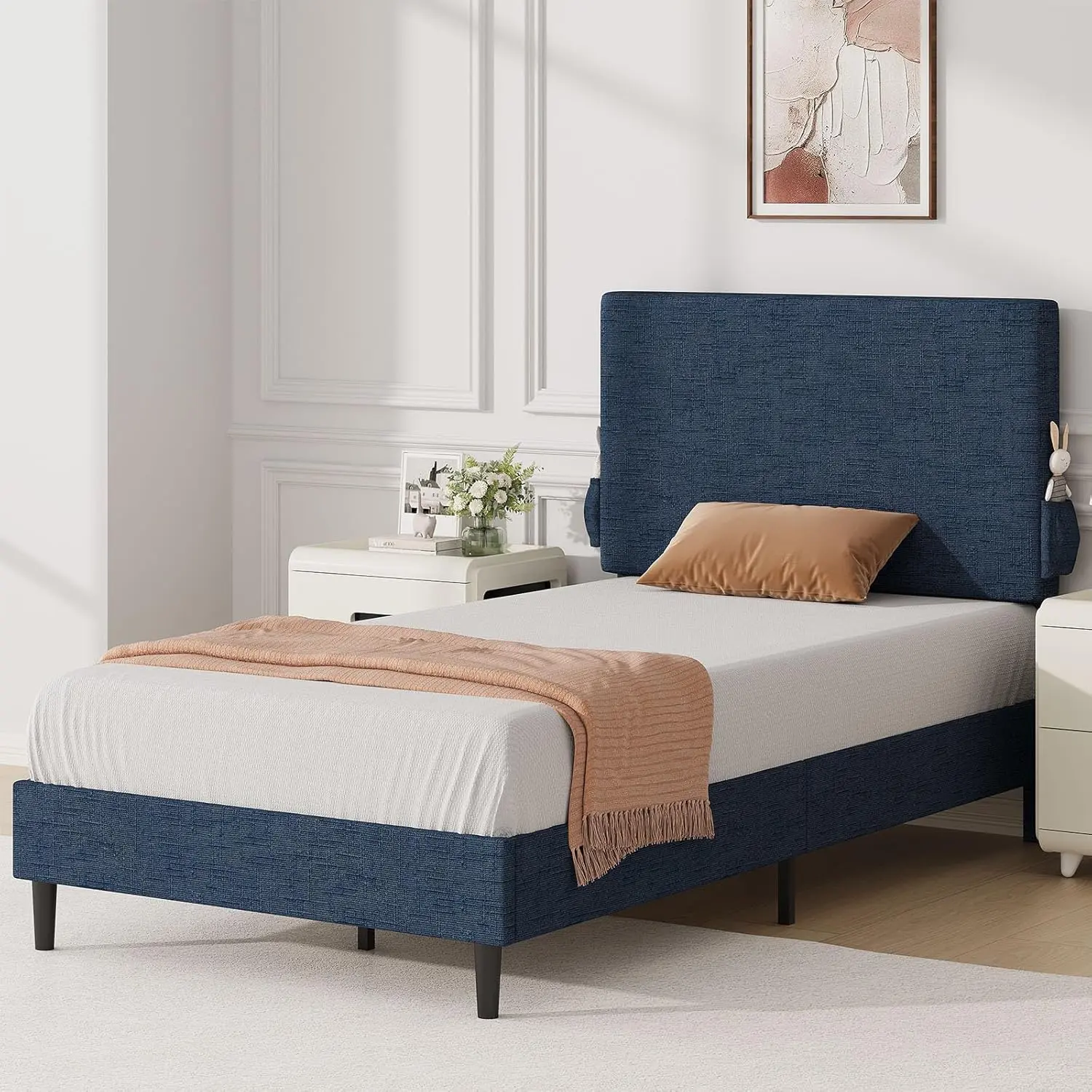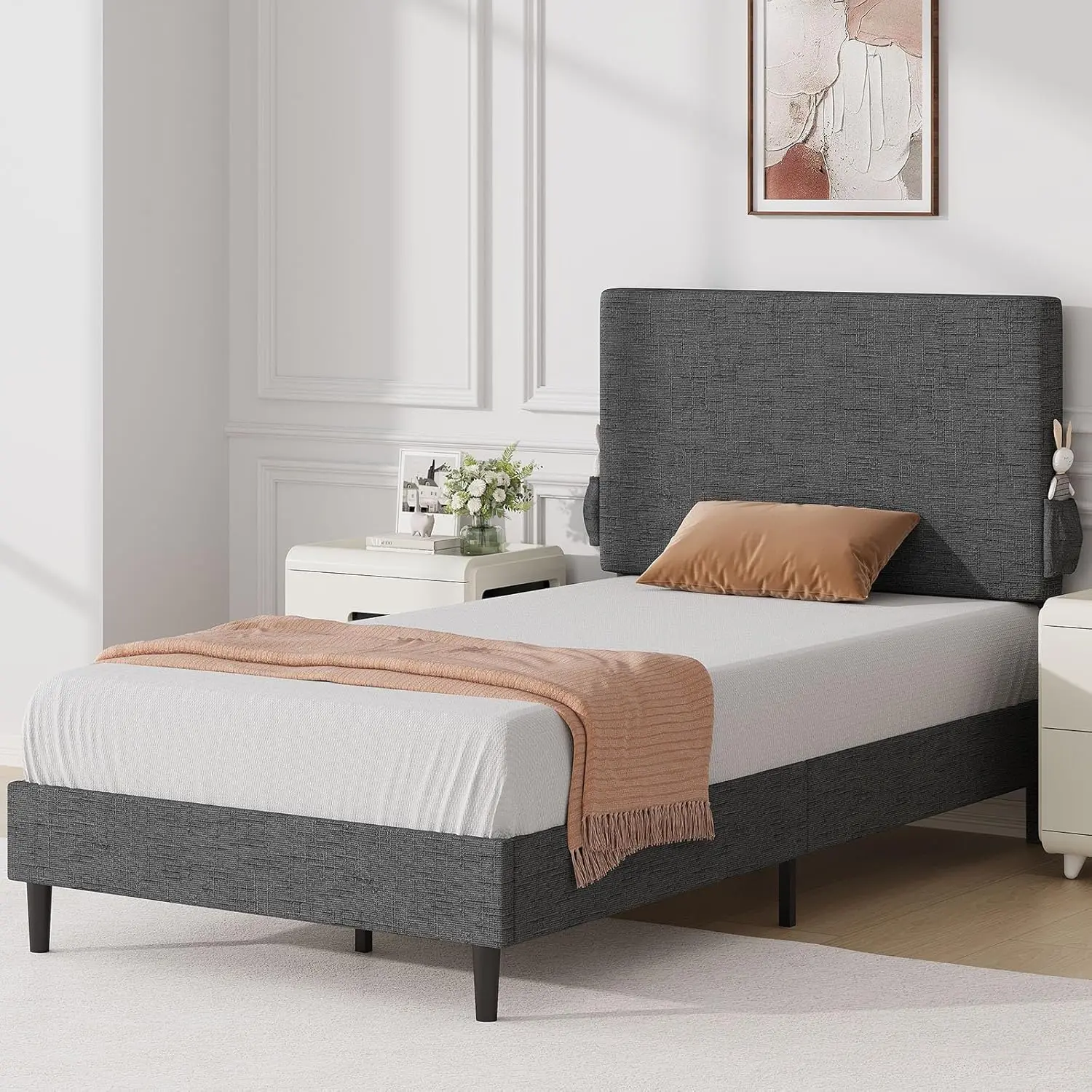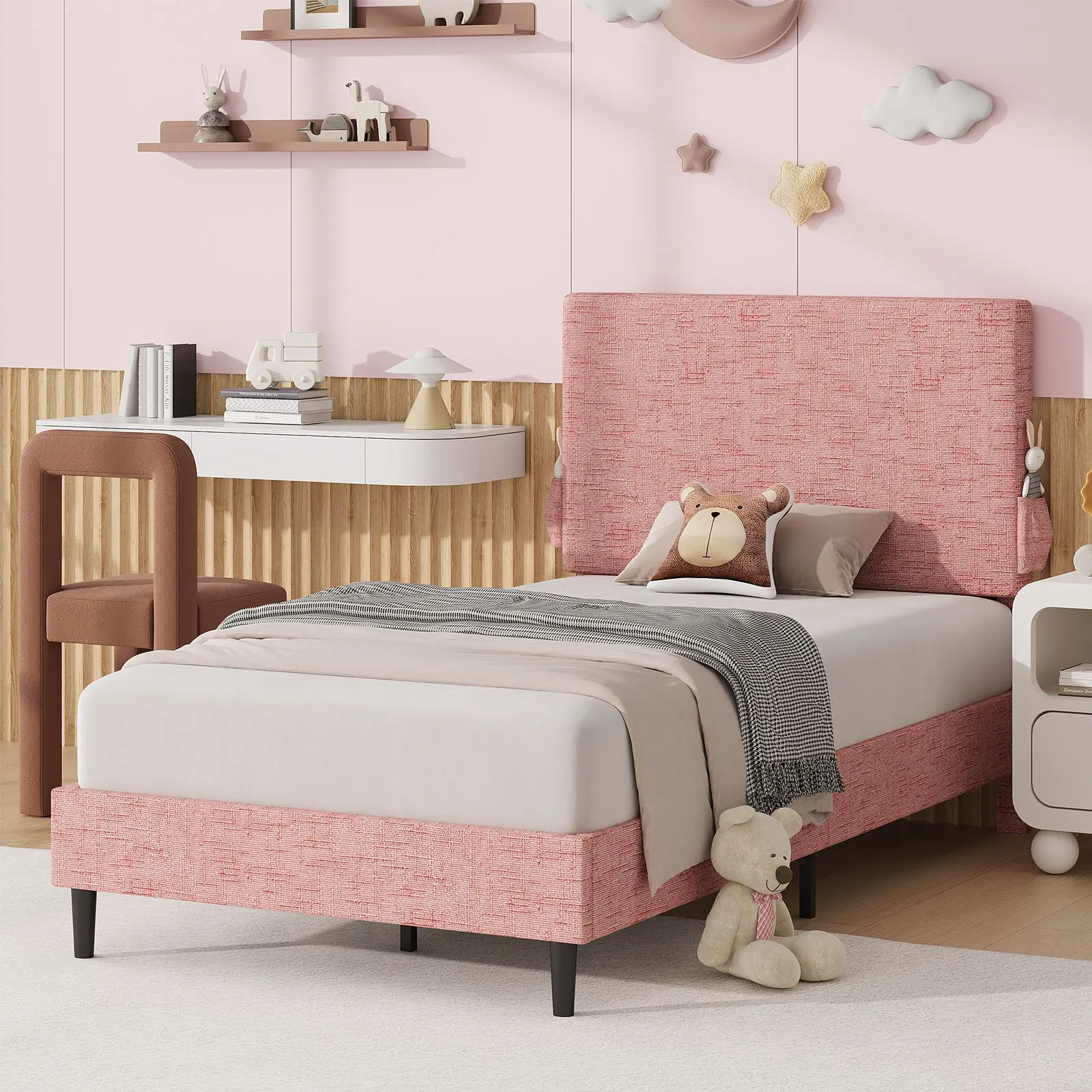 ·Chenille Charm: Padded with generous foam and wrapped in soft chenille fabric, this kids twin bed frame features a designed-textured headboard and side storage pockets—blending function with modern design to create a warm ambiance