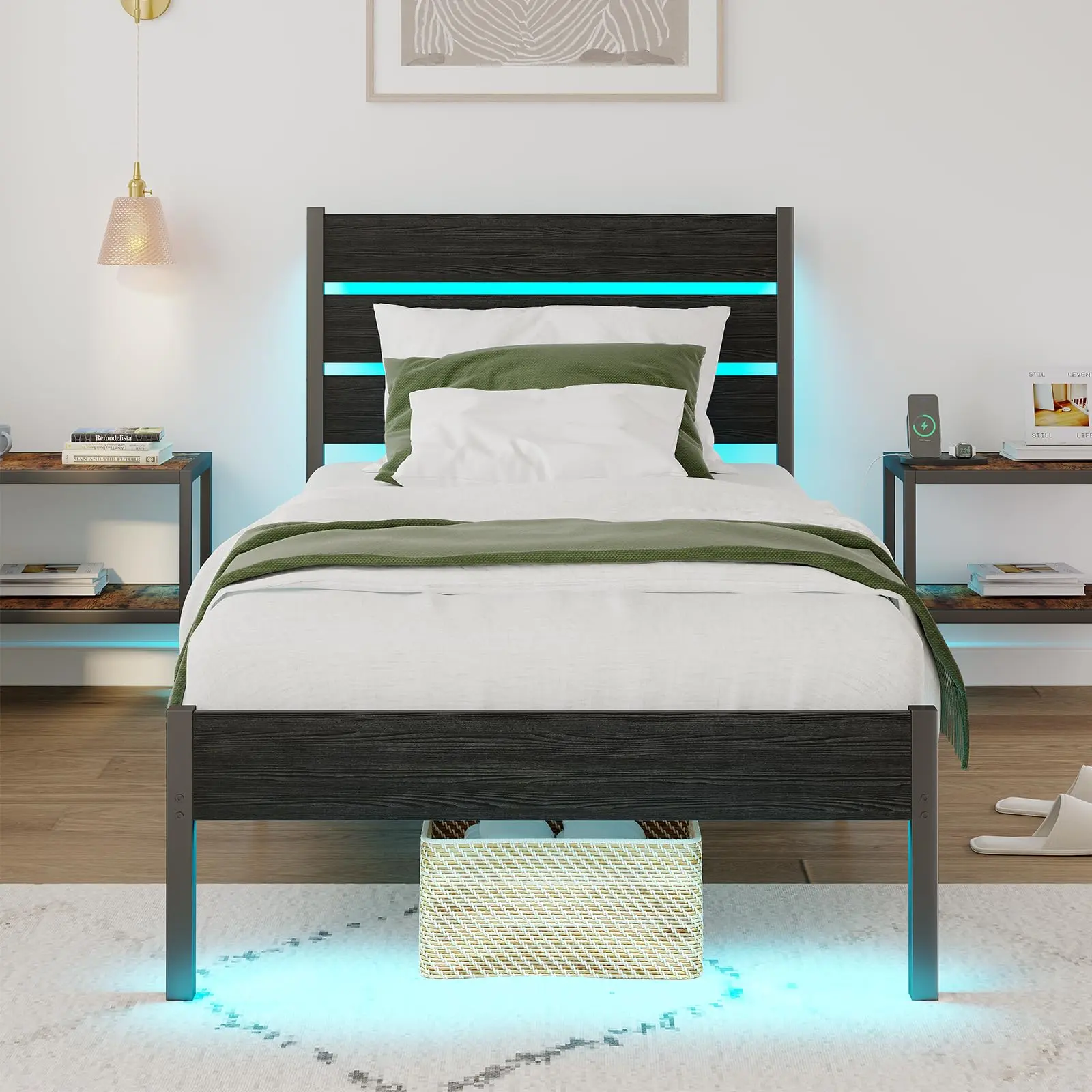 ·【Bed frame with LED light】: The LED light of the headboard and footboard provide a leisurely atmosphere for your night. The lights have 12 scene changes, 3 speed adjustments and 3 brightness adjustments, and can be operated by remote control and smart phone operation.
